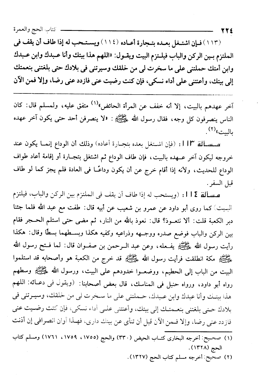 مسألة 113: (فإن اشتغل بعده بتجارة أعاده) وذلك أن الوداع إنما يكون عند خروجه ليكون آخر عهده بالبيت، فإن طاف الوداع ثم اشتغل بتجارة أو إقامة أعاد طواف الوداع للحديث ولأنه إذا أقام خرج عن أن يكون وداعًا في العادة فلم يجز كما لو طاف قبل السفر.