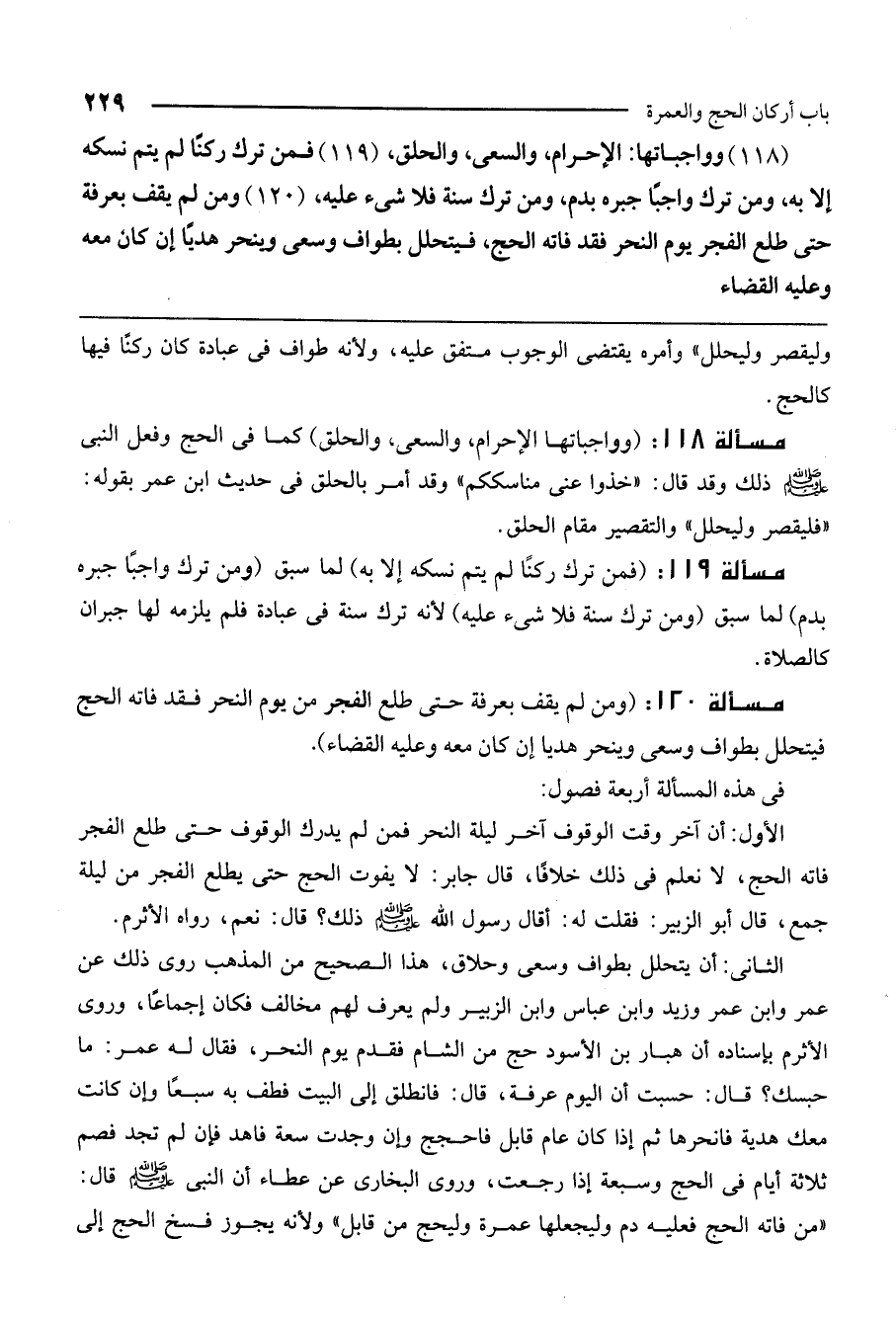 (120) ومن لم يقف بعرفة حتى طلع الفجر يوم النحر فقد فاته الحج، فيتحلل بطواف وسعي وينحر هديًا إن كان معه وعليه القضاء