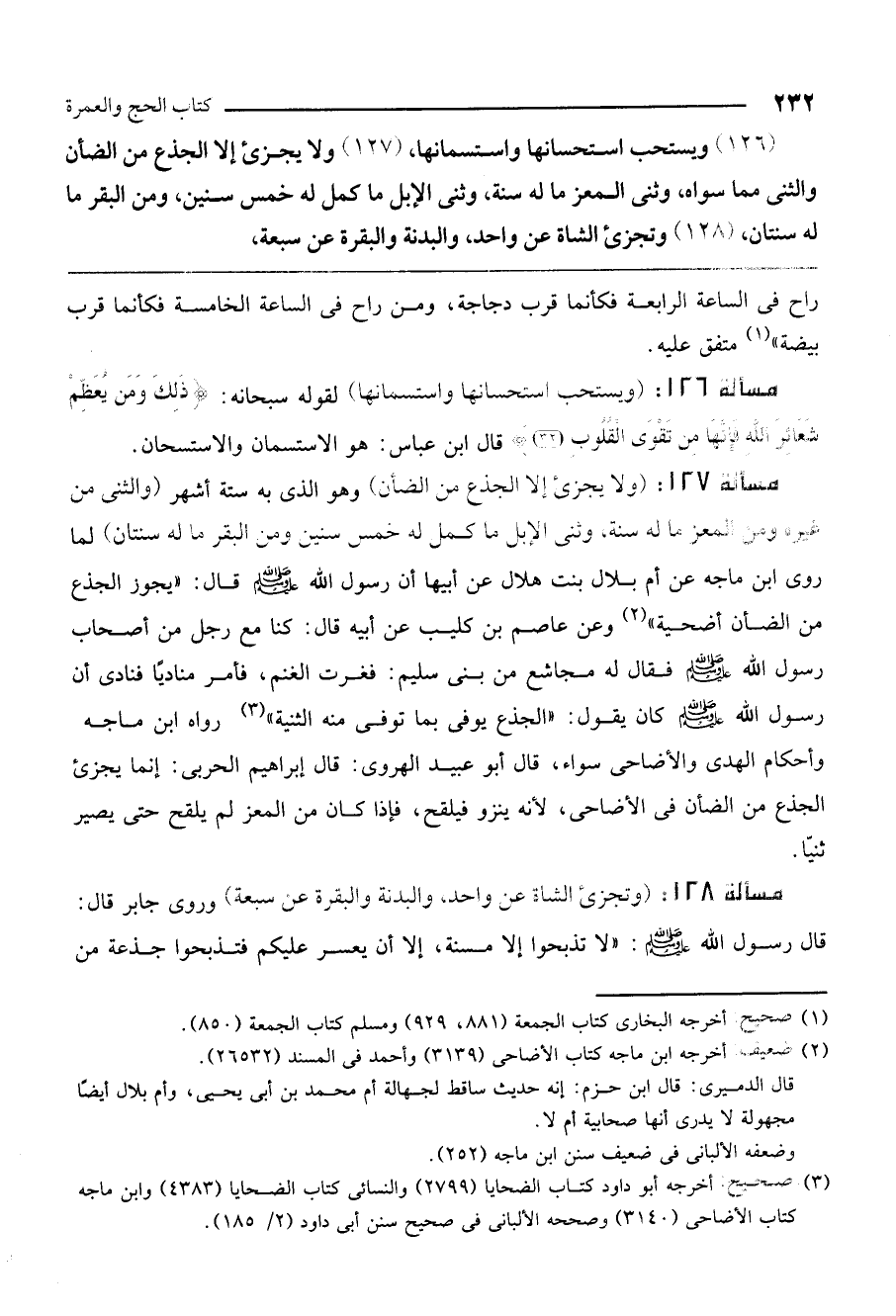 مسألة 128: (وتجزئ الشاة عن واحد، والبدنة والبقرة عن سبعة) وروى جابر قال: قال رسول الله - صَلَّى اللَّهُ عَلَيْهِ وَسَلَّمَ -: «لا تذبحوا إلا مسنة، إلا أن يعسر عليكم فتذبحوا جذعة من