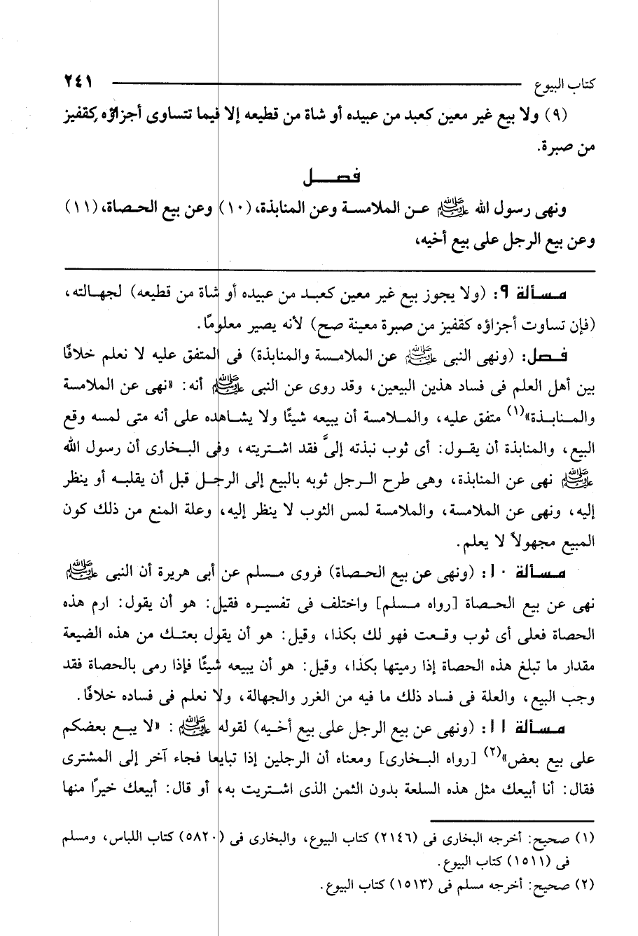 مسألة 10: (ونهى عن بيع الحصاة) فروى مسلم عن أبي هريرة «أن النبي - صَلَّى اللَّهُ عَلَيْهِ وَسَلَّمَ - نهى عن بيع الحصاة» [رواه مسلم] . واختلف في تفسيره فقيل: هو أن يقول: ارم هذه الحصاة فعلى أي ثوب وقعت فهو لك بكذا، وقيل: هو أن يقول بعتك من هذه الضيعة مقدار ما تبلغ هذه الحصاة إذا رميتها بكذا، وقيل: هو أن يبيعه شيئًا فإذا رمى بالحصاة فقد وجب البيع. والعلة في فساد ذلك ما فيه من الغرر والجهالة، ولا نعلم في فساده خلافًا.
