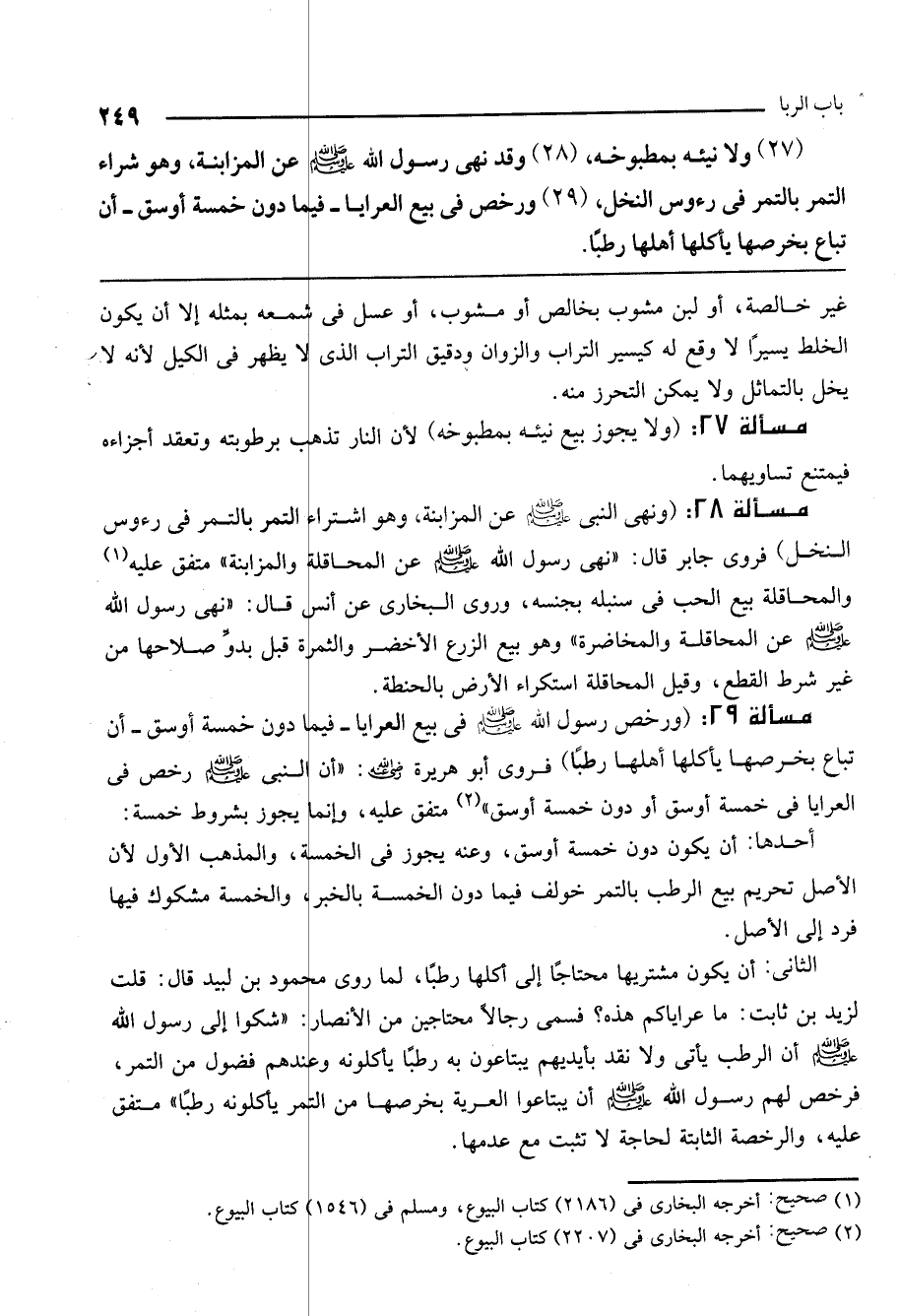 مسألة 29: (ورخص رسول الله - صَلَّى اللَّهُ عَلَيْهِ وَسَلَّمَ - في بيع العرايا - فيما دون خمسة أوسق - أن تباع بخرصها يأكلها أهلها رطبًا) فروى أبو هريرة - رَضِيَ اللَّهُ عَنْهُ -: «أن النبي - صَلَّى اللَّهُ عَلَيْهِ وَسَلَّمَ - رخص في العرايا في خمسة أوسق أو دون خمسة أوسق» متفق عليه، وإنما يجوز بشروط خمسة:
