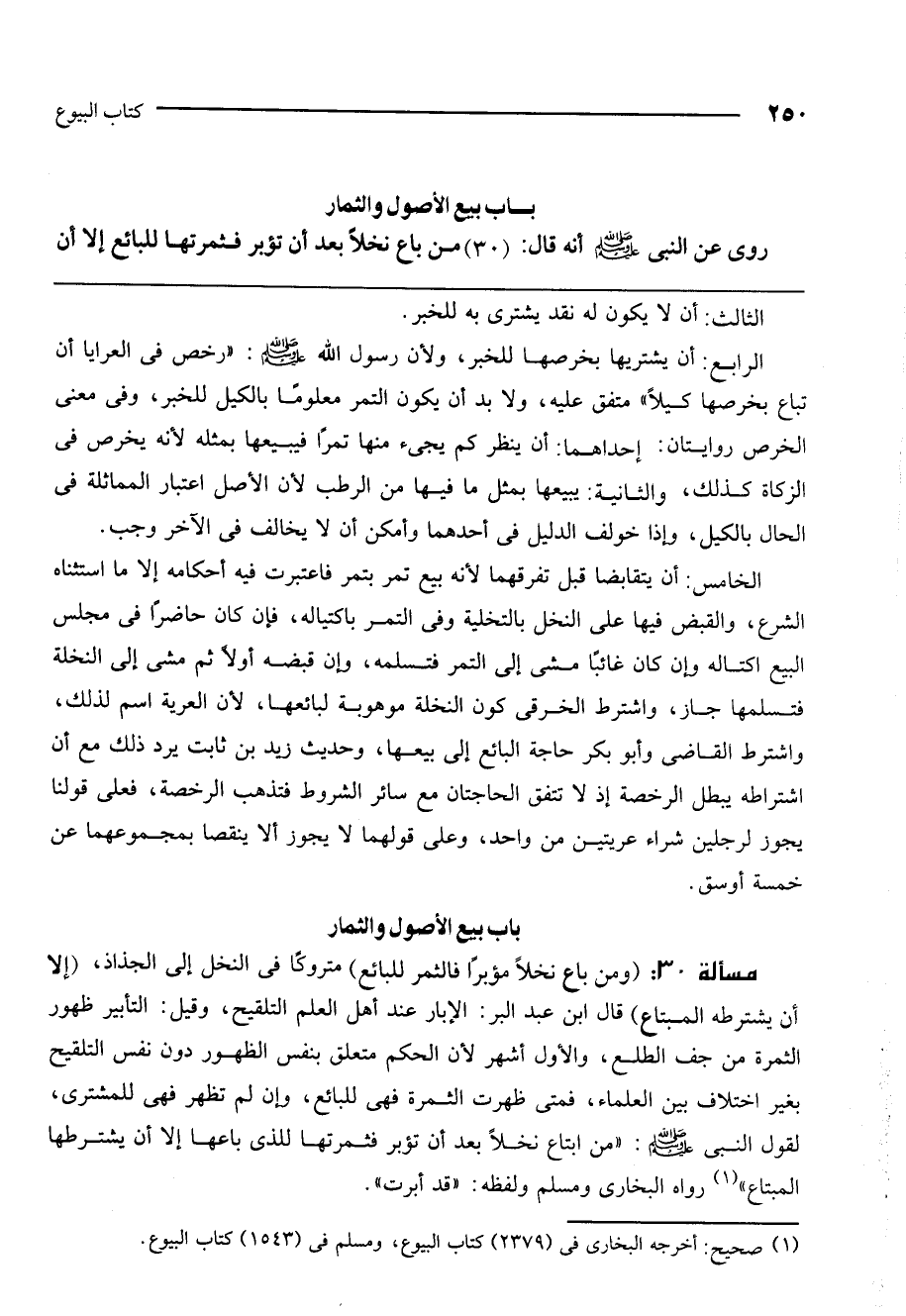 باب بيع الأصول والثمار روي عن النبي - صَلَّى اللَّهُ عَلَيْهِ وَسَلَّمَ - أنه قال: « (30) من باع نخلا بعد أن تؤبر فثمرتها للبائع إلا أن