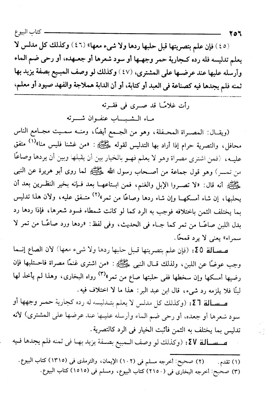 مسألة 45: (فإن علم بتصريتها قبل حلبها ردها ولا شيء معها) لأن الصاع إنما وجب عوضًا عن اللبن، ولذلك قال النبي - صَلَّى اللَّهُ عَلَيْهِ وَسَلَّمَ -: «من اشترى غنمًا مصراة فاحتلبها فإن رضيها أمسكها وإن سخطها ففي حلبتها صاع من تمر» رواه البخاري. وهذا لم يأخذ لها لبنًا فلا يلزمه رد شيء، قال ابن عبد البر: هذا ما لا اختلاف فيه.