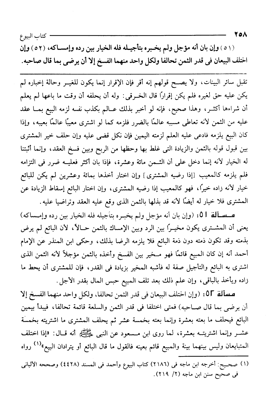 مسألة 51: (وإن بان أنه مؤجل ولم يخبره بتأجيله فله الخيار بين رده وإمساكه) يعني أن المشتري يكون مخيرًا بين الرد وبين الإمساك بالثمن حالًا، لأن البائع لم يرض بذمته وقد تكون ذمته دون ذمة البائع فلا يلزمه الرضا بذلك. وحكى ابن المنذر عن الإمام أحمد أنه إن كان المبيع قائمًا فهو مخير بين الفسخ وأخذه بالثمن مؤجلًا لأنه الثمن الذي اشترى به البائع، والتأجيل صفة له فأشبه المخير بزيادة في القدر، فإن للمشتري أن يحط ما زاده ويأخذ بالباقي، وإن علم ذلك بعد تلف المبيع حبس المال بقدر الأجل.