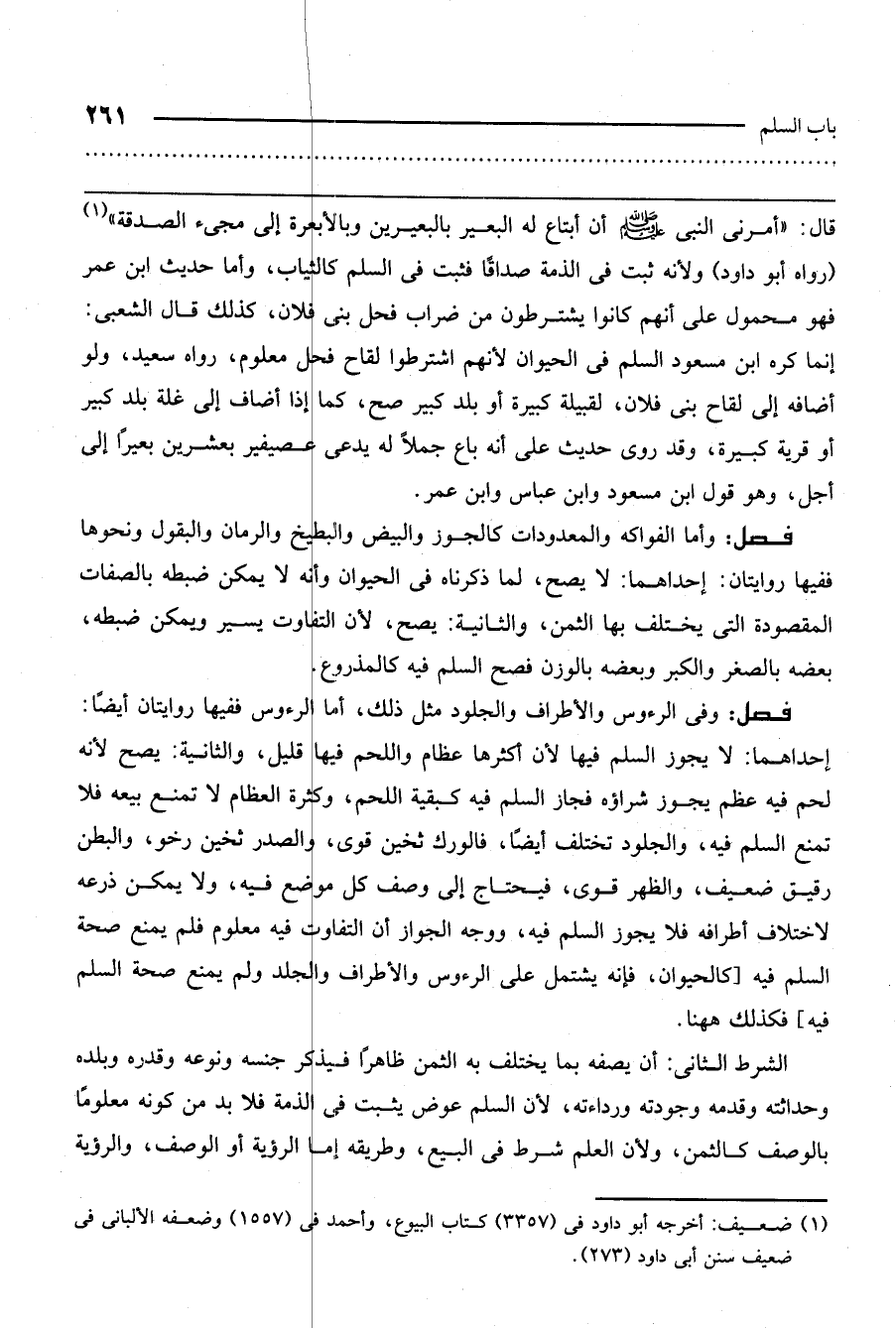 ـــــــــــــــــــــــــــــQقال: «أمرني النبي - صَلَّى اللَّهُ عَلَيْهِ وَسَلَّمَ - أن أبتاع له البعير بالبعيرين وبالأبعرة إلى مجيء الصدقة» (رواه أبو داود) ، ولأنه ثبت في الذمة صداقًا فثبت في السلم كالثياب. وأما حديث ابن عمر فهو محمول على أنهم كانوا يشترطون من ضراب فحل بني فلان، كذلك قال الشعبي: إنما كره ابن مسعود السلم في الحيوان لأنهم اشترطوا لقاح فحل معلوم. رواه سعيد. ولو أضافه إلى لقاح بني فلان، لقبيلة كبيرة أو بلد كبير صح، كما إذا أضاف إلى غلة بلد كبير أو قرية كبيرة. وقد روي حديث علي أنه باع جملًا له يدعى عصيفير بعشرين بعيرًا إلى أجل، وهو قول ابن مسعود وابن عباس وابن عمر.