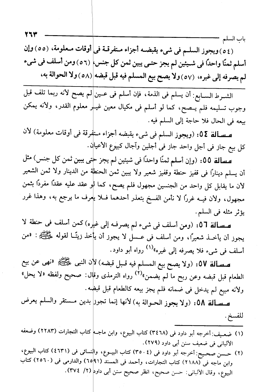 مسألة 56: (ومن أسلف في شيء لم يصرفه إلى غيره) كمن أسلف في حنطة لا يجوز أن يأخذ شعيرًا، ومن أسلف في عسل لا يجوز أن يأخذ زيتًا لقوله - صَلَّى اللَّهُ عَلَيْهِ وَسَلَّمَ -: «من أسلف في شيء فلا يصرفه إلى غيره» رواه أبو داود.