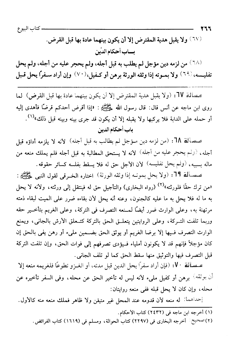 ـــــــــــــــــــــــــــــQمسألة 67: (ولا يقبل هدية المقترض إلا أن يكون بينهما عادة بها قبل القرض) لما روى ابن ماجه عن أنس قال: قال رسول الله - صَلَّى اللَّهُ عَلَيْهِ وَسَلَّمَ -: «إذا أقرض أحدكم قرضًا فأهدى إليه أو حمله على الدابة فلا يركبها ولا يقبله إلا أن يكون قد جرى بينه وبينه قبل ذلك» .