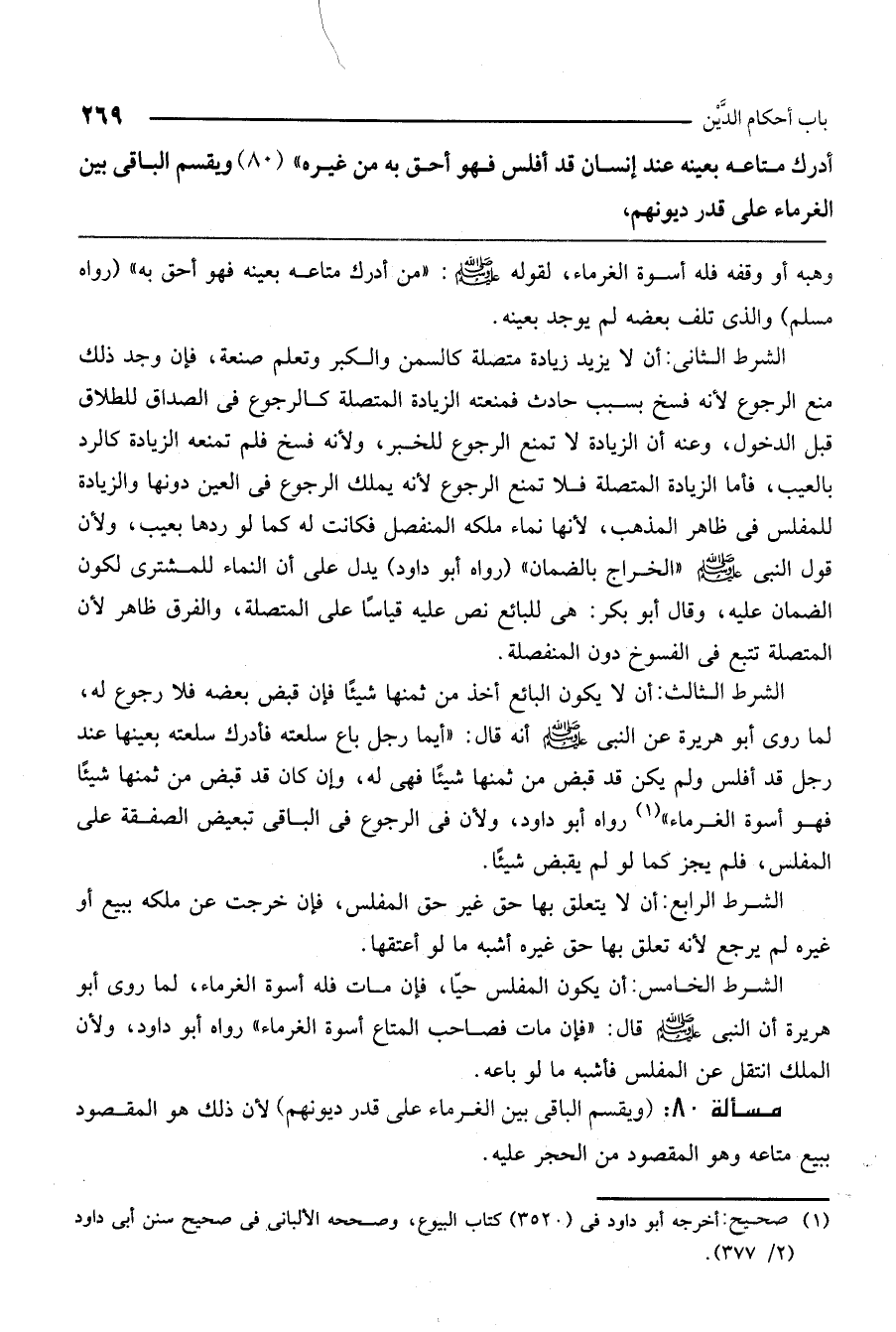 الشرط الخامس: أن يكون المفلس حيًا، فإن مات فله أسوة الغرماء، لما روى أبو هريرة أن النبي - صَلَّى اللَّهُ عَلَيْهِ وَسَلَّمَ - قال: «فإن مات فصاحب المتاع أسوة الغرماء» رواه أبو داود، ولأن الملك انتقل عن المفلس فأشبه ما لو باعه.