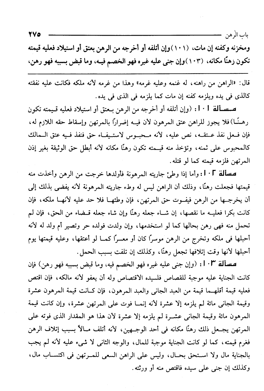 مسألة 103: (وإن جنى عليه غيره فهو الخصم فيه، وما قبض بسببه فهو رهن) فإن كانت الجناية عليه موجبة للقصاص فلسيده الاقتصاص وله أن يعفو لأنه مالكه، فإن اقتص فعليه قيمة أقلها قيمة من العبد الجاني والعبد المرهون، فإن كانت قيمة المرهون عشرة وقيمة الجاني مائة لم يلزمه إلا عشرة لأنه إنما فوت على المرتهن عشرة، وإن كانت قيمة المرهون مائة وقيمة الجاني عشرة لم يلزمه إلا عشرة لأن هذا هو المقدار الذي فوته على المرتهن يجعل ذلك رهنًا مكانه في أحد الوجهين؛ لأنه أتلف مالًا بسبب إتلاف الرهن فغرم قيمته، كما لو كانت الجناية موجبة للمال، والوجه الثاني لا شيء عليه لأنه لم يجب بالجناية مال ولا استحق بحال، وليس على الراهن السعي للمرتهن في اكتساب مال، وكذلك إن جنى على سيده فاقتص منه أو ورثته.