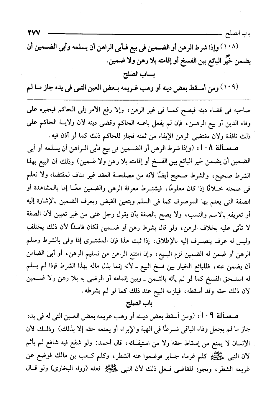 مسألة 109: (ومن أسقط بعض دينه أو وهب غريمه بعض العين التي له في يده جاز ما لم يجعل وفاء الباقي شرطًا في الهبة والإبراء أو يمنعه حقه إلا بذلك) وذلك لأن الإنسان لا يمنع من إسقاط حقه ولا من استيفائه، قال أحمد: ولو شفع فيه شافع لم يأثم لأن النبي - صَلَّى اللَّهُ عَلَيْهِ وَسَلَّمَ - كلم غرماء جابر فوضعوا عنه الشطر، وكلم كعب بن مالك فوضع عن غريمه الشطر، ويجوز للقاضي فعل ذلك لأن النبي - صَلَّى اللَّهُ عَلَيْهِ وَسَلَّمَ - فعله (رواه البخاري) ، ولو قال