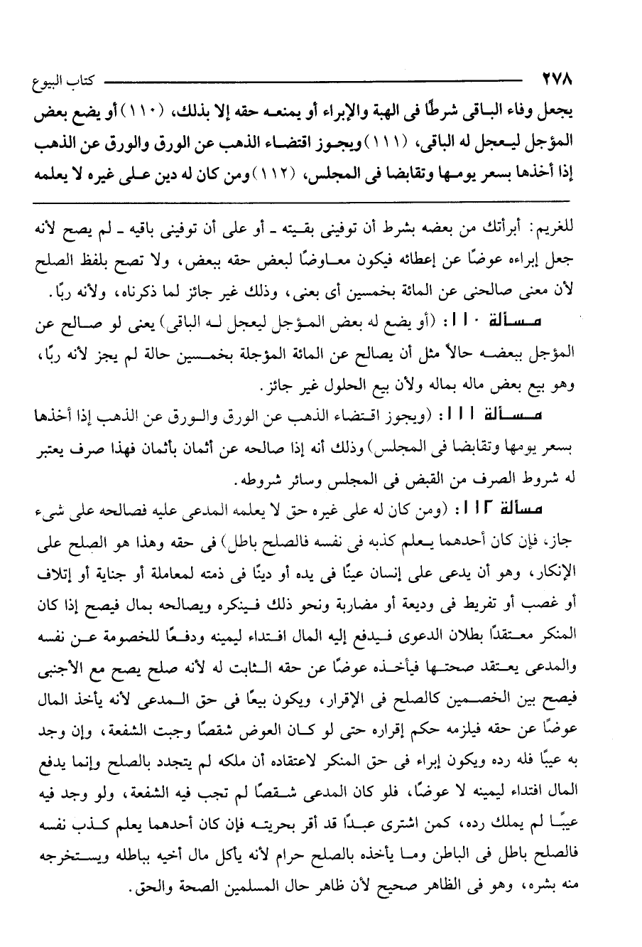 مسألة 111: (ويجوز اقتضاء الذهب عن الورق والورق عن الذهب إذا أخذها بسعر يومها وتقابضا في المجلس) وذلك أنه إذا صالحه عن أثمان بأثمان فهذا صرف يعتبر له شروط الصرف من القبض في المجلس وسائر شروطه.