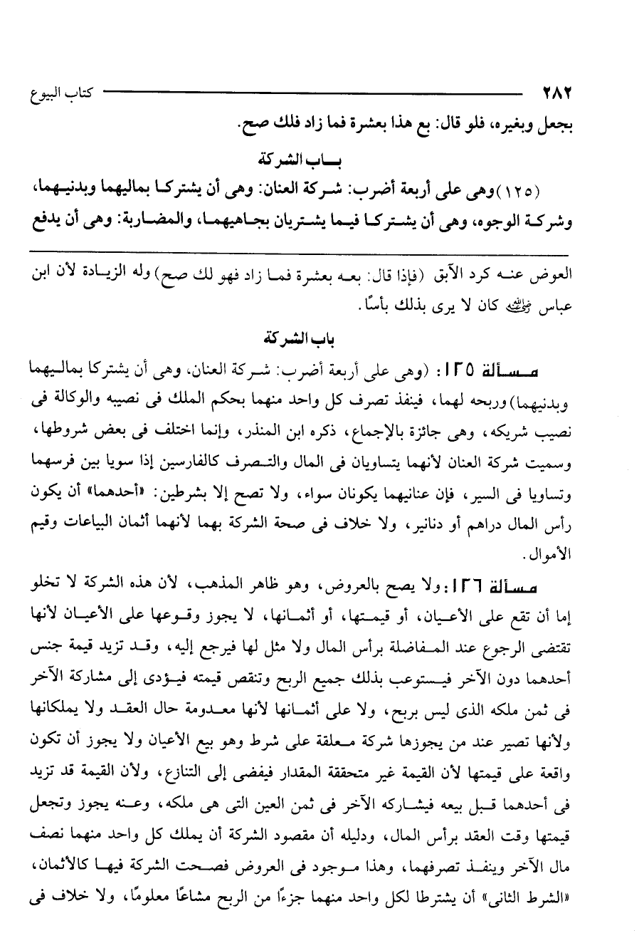باب الشركة (125) وهي على أربعة أضرب: شركة العنان، وهي أن يشتركا بماليهما وبدنيهما