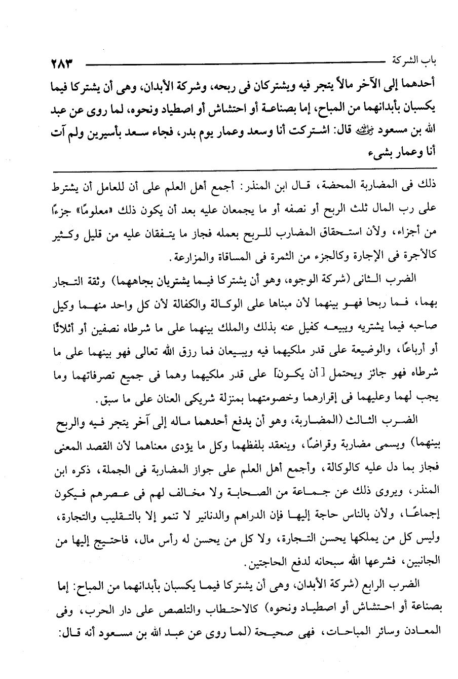 أحدهما إلى الآخر مالا يتجر فيه ويشتركان في ربحه، وشركة الأبدان، وهي أن يشتركا فيما يكسبان بأبدانهما من المباح، إما بصناعة أو احتشاش أو اصطياد ونحوه، لما روي «عن عبد الله بن مسعود - رَضِيَ اللَّهُ عَنْهُ - قال: اشتركت أنا وسعد وعمار يوم بدر، فجاء سعد بأسيرين ولم آت أنا وعمار بشيء»