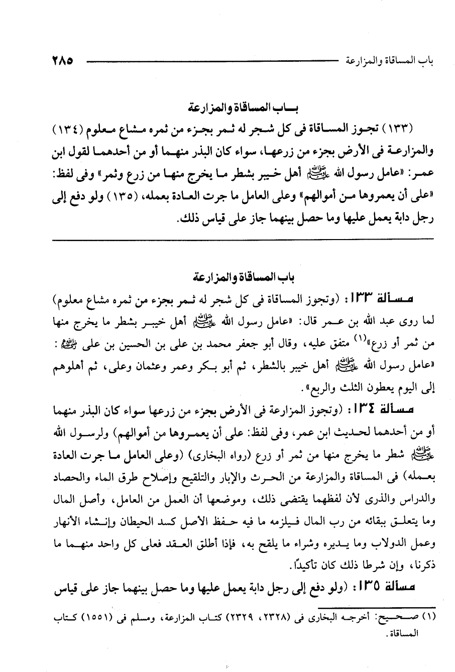 (134) والمزارعة في الأرض بجزء من زرعها، سواء كان البذر منهما أو من أحدهما لقول ابن عمر: «عامل رسول الله - صَلَّى اللَّهُ عَلَيْهِ وَسَلَّمَ - أهل خيبر بشطر ما يخرج منها من زرع وثمر " وفي لفظ: " على أن يعمروها من أموالهم» وعلى العامل ما جرت العادة بعمله