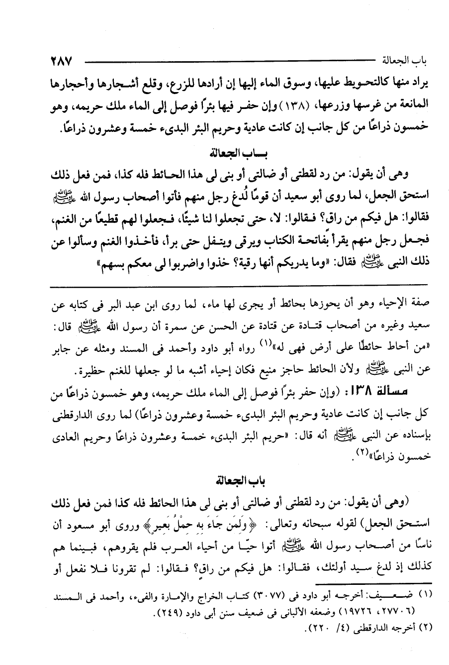 مسألة 138: (وإن حفر بئرًا فوصل إلى الماء ملك حريمه، وهو خمسون ذراعًا من كل جانب إن كانت عادية وحريم البئر البديء خمسة وعشرون ذراعًا) لما روى الدارقطني بإسناده عن النبي - صَلَّى اللَّهُ عَلَيْهِ وَسَلَّمَ - أنه قال: «حريم البئر البديء خمسة وعشرون ذراعًا وحريم العادي خمسون ذراعًا» .