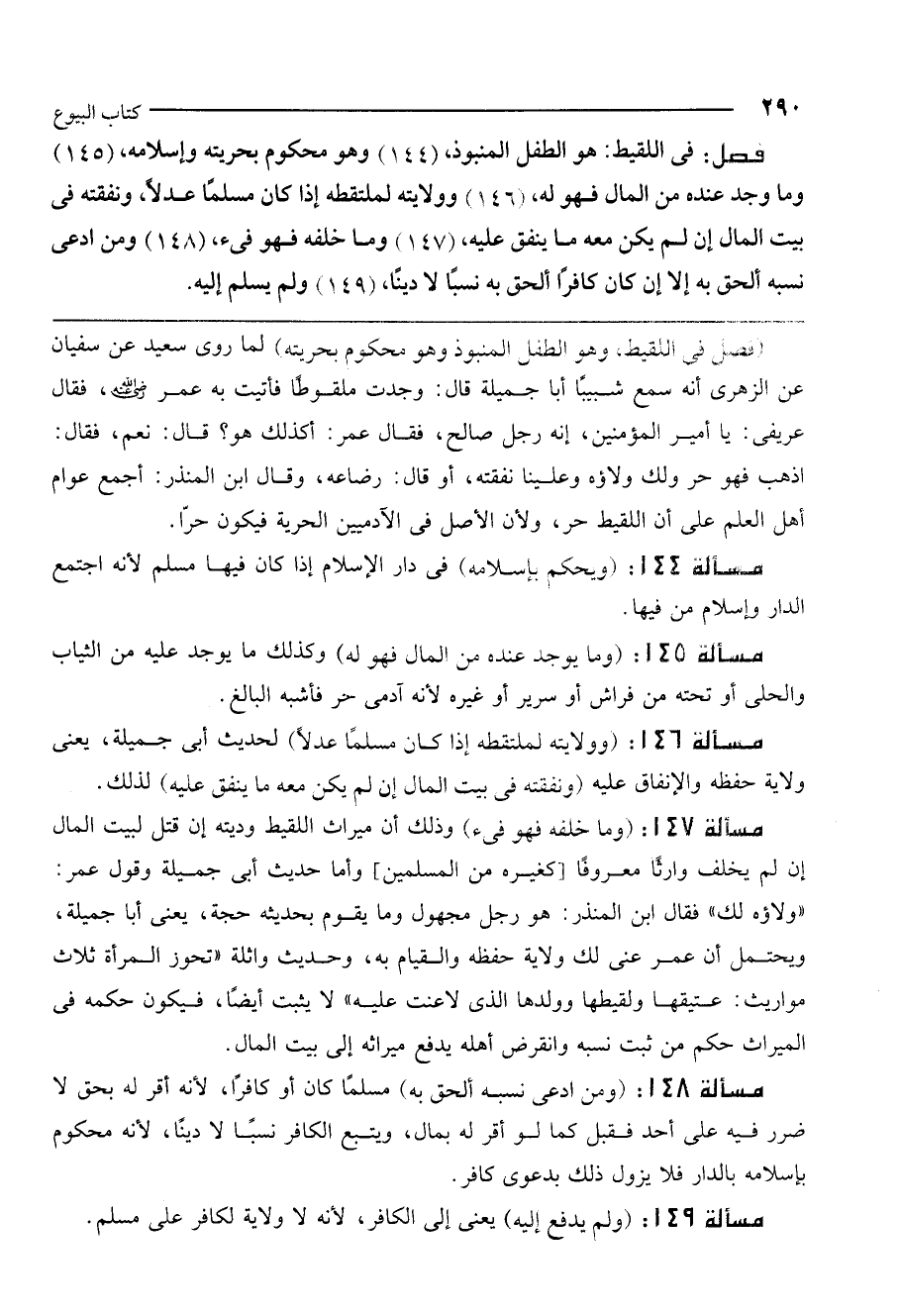 مسألة 147: (وما خلفه فهو فيء) وذلك أن ميراث اللقيط وديته إن قتل لبيت المال إن لم يخلف وارثًا معروفًا [كغيره من المسلمين] وأما حديث أبي جميلة وقول عمر: "ولاؤه لك" فقال ابن المنذر: هو رجل مجهول وما يقوم بحديثه حجة، يعني أبا جميلة. ويحتمل أن عمر عني لك ولاية حفظه والقيام به، وحديث واثلة «تحوز المرأة ثلاث مواريث: عتيقها ولقيطها وولدها الذي لاعنت عليه» لا يثبت أيضًا، فيكون حكمه في الميراث حكم من ثبت نسبه وانقرض أهله يدفع ميراثه إلى بيت المال.
