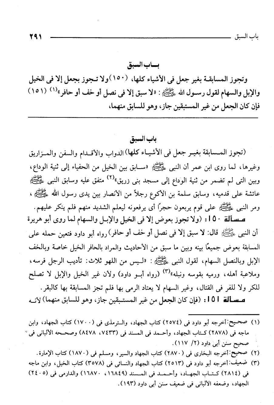 مسألة 150: (ولا تجوز بعوض إلا في الخيل والإبل والسهام لما روى أبو هريرة أن النبي - صَلَّى اللَّهُ عَلَيْهِ وَسَلَّمَ - قال: «لا سبق إلا في نصل أو خف أو حافر» رواه أبو داود، فتعين حمله على المسابقة بعوض جمعًا بينه وبين ما سبق من الأحاديث. والمراد بالحافر الخيل خاصة، وبالخف الإبل، وبالنصل السهام، لقول النبي - صَلَّى اللَّهُ عَلَيْهِ وَسَلَّمَ -: «ليس من اللهو ثلاث: تأديب الرجل فرسه، وملاعبة أهله، ورميه بقوسه ونبله» (رواه أبو داود) ولأن غير الخيل والإبل لا تصلح للكر ولا للفر في القتال، وغير السهام لا يعتاد الرمي بها فلم تجز المسابقة بها كالبقر.
