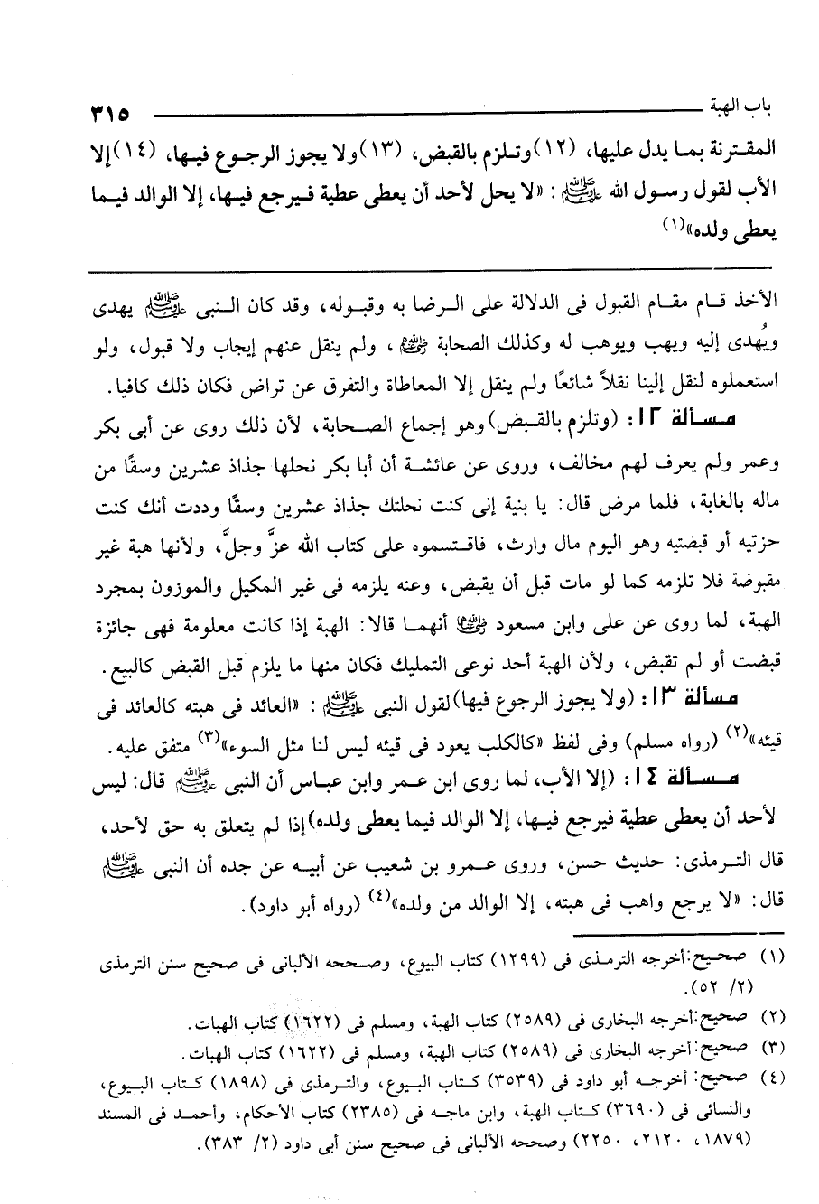 مسألة 13: (ولا يجوز الرجوع فيها) لقول النبي - صَلَّى اللَّهُ عَلَيْهِ وَسَلَّمَ -: «العائد في هبته كالعائد في قيئه» (رواه مسلم) وفي لفظ «كالكلب يعود في قيئه، ليس لنا مثل السوء» متفق عليه.