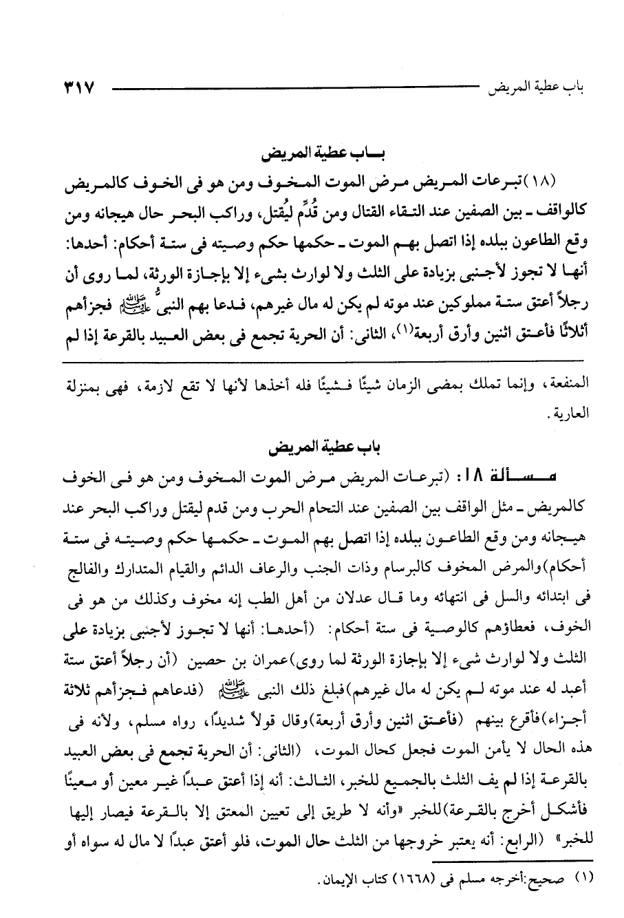 مسألة 18: (تبرعات المريض مرض الموت المخوف ومن هو في الخوف كالمريض - مثل الواقف بين الصفين عند التحام الحرب ومن قدم ليقتل وراكب البحر عند هيجانه ومن وقع الطاعون ببلده إذا اتصل بهم الموت - حكمها حكم وصيته في ستة أحكام) . والمرض المخوف كالبرسام وذات الجنب والرعاف الدائم والقيام المتدارك والفالج في ابتدائه والسل في انتهائه وما قال عدلان من أهل الطب إنه مخوف، وكذلك من هو في الخوف، فعطاؤهم كالوصية في ستة أحكام: (أحدها: أنها لا تجوز لأجنبي بزيادة على الثلث ولا لوارث شيء إلا بإجازة الورثة لما روى) عمران بن حصين (أن رجلًا أعتق ستة أعبد له عند موته لم يكن له مال غيرهم) فبلغ ذلك النبي - صَلَّى اللَّهُ عَلَيْهِ وَسَلَّمَ - (فدعاهم فجزأهم ثلاثة أجزاء) فأقرع بينهم (فأعتق اثنين وأرق أربعة) وقال قولًا شديدًا، رواه مسلم، ولأنه في هذه الحال لا يأمن الموت فجعل كحال الموت. (الثاني: أن الحرية تجمع في بعض العبيد بالقرعة إذا لم يف الثلث بالجميع للخبر، الثالث: أنه إذا أعتق عبدًا غير معين أو معينًا فأشكل أخرج بالقرعة) للخبر "وأنه لا طريق إلى تعيين المعتق إلا بالقرعة فيصار إليها للخبر" (الرابع: أنه يعتبر خروجها من الثلث حال الموت، فلو أعتق عبدًا لا مال له سواه أو