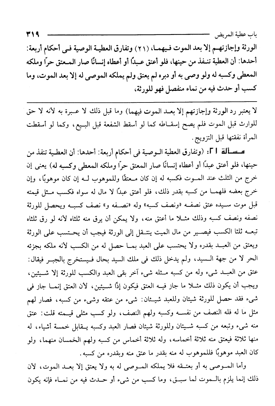 مسألة 21: (وتفارق العطية الوصية في أحكام أربعة: أحدها: أن العطية تنفذ من حينها. فلو أعتق عبدًا أو أعطاه إنسانًا صار المعتق حرًا وملكه المعطي وكسبه له) يعني إن خرج من الثلث عند الموت فكسبه له إن كان معتقًا وللموهوب له إن كان موهوبًا، وإن خرج بعضه فلهما من كسبه بقدر ذلك، فلو أعتق عبدًا لا مال له سواه فكسب مثل قيمته قبل موت سيده عتق نصفه "ونصف كسبه" وله "نصفه و" نصف كسبه ويحصل للورثة نصفه ونصف كسبه، وذلك مثل ما أعتق منه، ولا يمكن أن يرق منه ثلثاه لأنه لو رق ثلثاه تبعه ثلثا الكسب فيصير من مال الميت ينتقل إلى الورثة، فيجب أن يحتسب على الورثة ويعتق من العبد بقدره ولا يحتسب على العبد بما حصل له من الكسب لأنه ملكه بجزئه الحر لا من جهة السيد، ولم يدخل ذلك في ملك السيد بحال فيستخرج بالجبر فيقال: عتق من العبد شيء وله من كسبه مثله شيء آخر بقي العبد والكسب للورثة إلا شيئين، ويجب أن يكون ذلك مثل ما جاز فيه العتق فيكون إذًا شيئين؛ لأن العتق إنما جاز في شيء فقد حصل للورثة شيئان، وللعبد شيئان: شيء من عتقه وشيء من كسبه، فصار لهم مثل ما له فله النصف من نفسه وكسبه ولهم النصف، ولو كسب مثلي قيمته قلت: عتق منه شيء وتبعه من كسبه شيئان وللورثة شيئان فصار العبد وكسبه يقابل خمسة أشياء، له منها ثلاثة فيعتق منه ثلاثة أخماسه، وله ثلاثة أخماس من كسبه ولهم الخمسان منهما. ولو كان العبد موهوبًا فللموهوب له منه بقدر ما عتق منه وبقدره من كسبه.