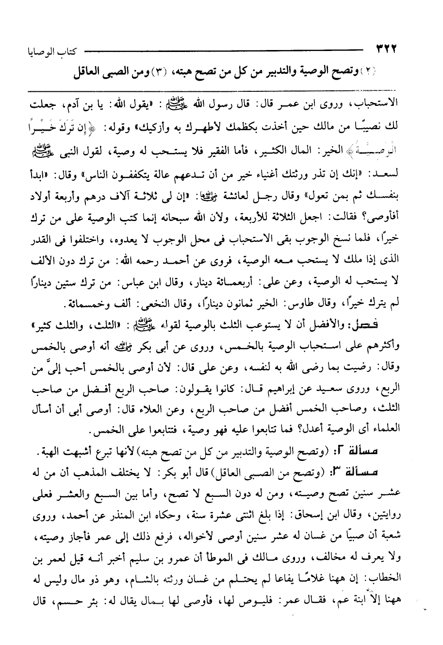 مسألة 3: (وتصح من الصبي والعاقل) قال أبو بكر: لا يختلف المذهب أن من له عشر سنين تصح وصيته، ومن له دون السبع لا تصح، وأما بين السبع والعشر فعلى روايتين. وقال ابن إسحاق: إذا بلغ اثنتي عشرة سنة. وحكاه ابن المنذر عن أحمد. وروى شعبة أن صبيًا من غسان له عشر سنين أوصى لأخواله، فرفع ذلك إلى عمر فأجاز وصيته، ولا يعرف له مخالف. وروى مالك في الموطأ أن عمرو بن سليم أخبر أنه قيل لعمر بن الخطاب: إن هاهنا غلامًا يفاعا لم يحتلم من غسان ورثته بالشام، وهو ذو مال وليس له هاهنا إلا ابنة عم، فقال عمر: فليوص لها، فأوصى لها بمال يقال له بئر حسم. قال