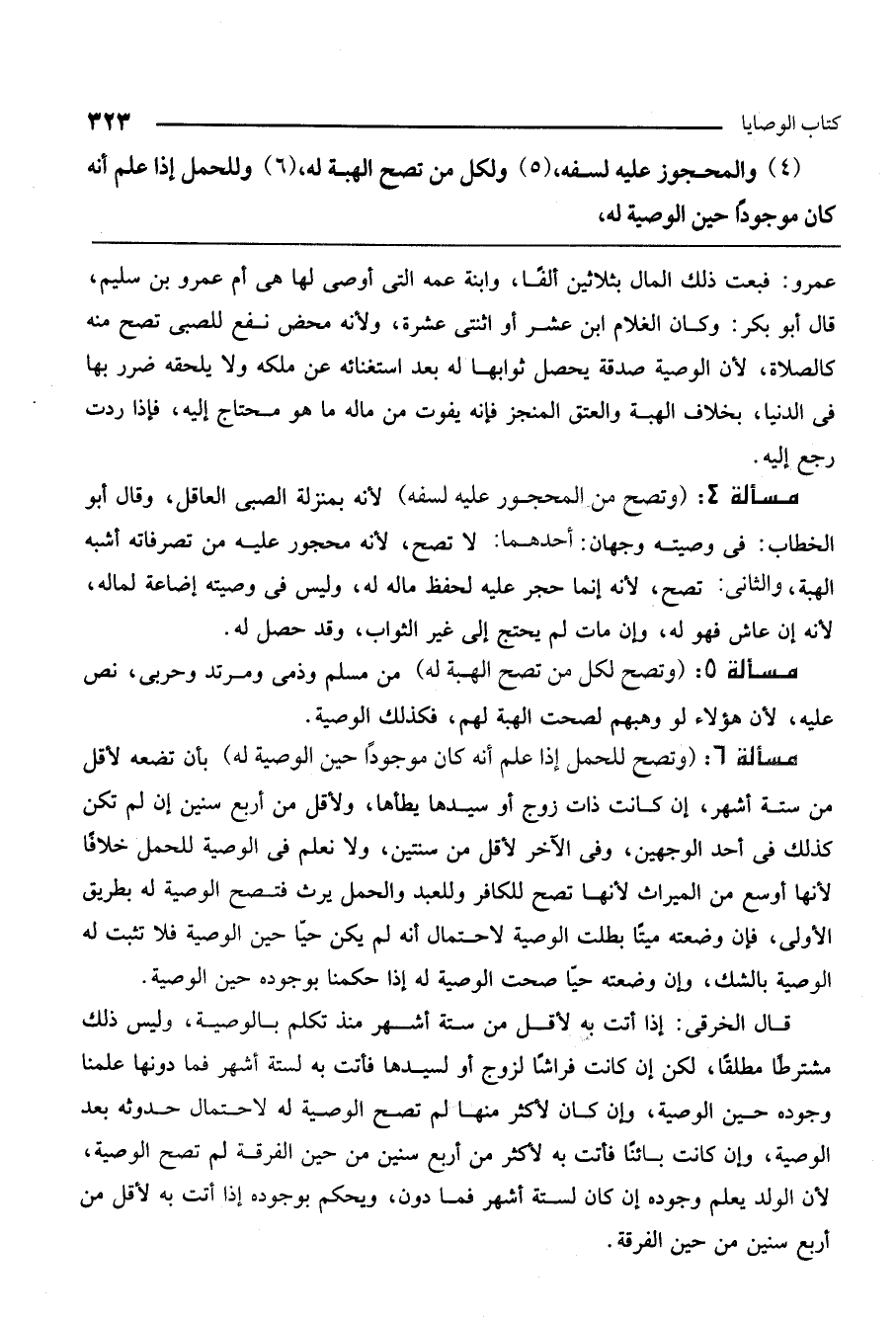 مسألة 4: (وتصح من المحجور عليه لسفه) لأنه بمنزلة الصبي العاقل. وقال أبو الخطاب: في وصيته وجهان: أحدهما: لا تصح، لأنه محجور عليه في تصرفاته أشبه الهبة. والثاني: تصح، لأنه إنما حجر عليه لحفظ ماله له، وليس في وصيته إضاعة لماله، لأنه إن عاش فهو له، وان مات لم يحتج إلى غير الثواب، وقد حصل له.