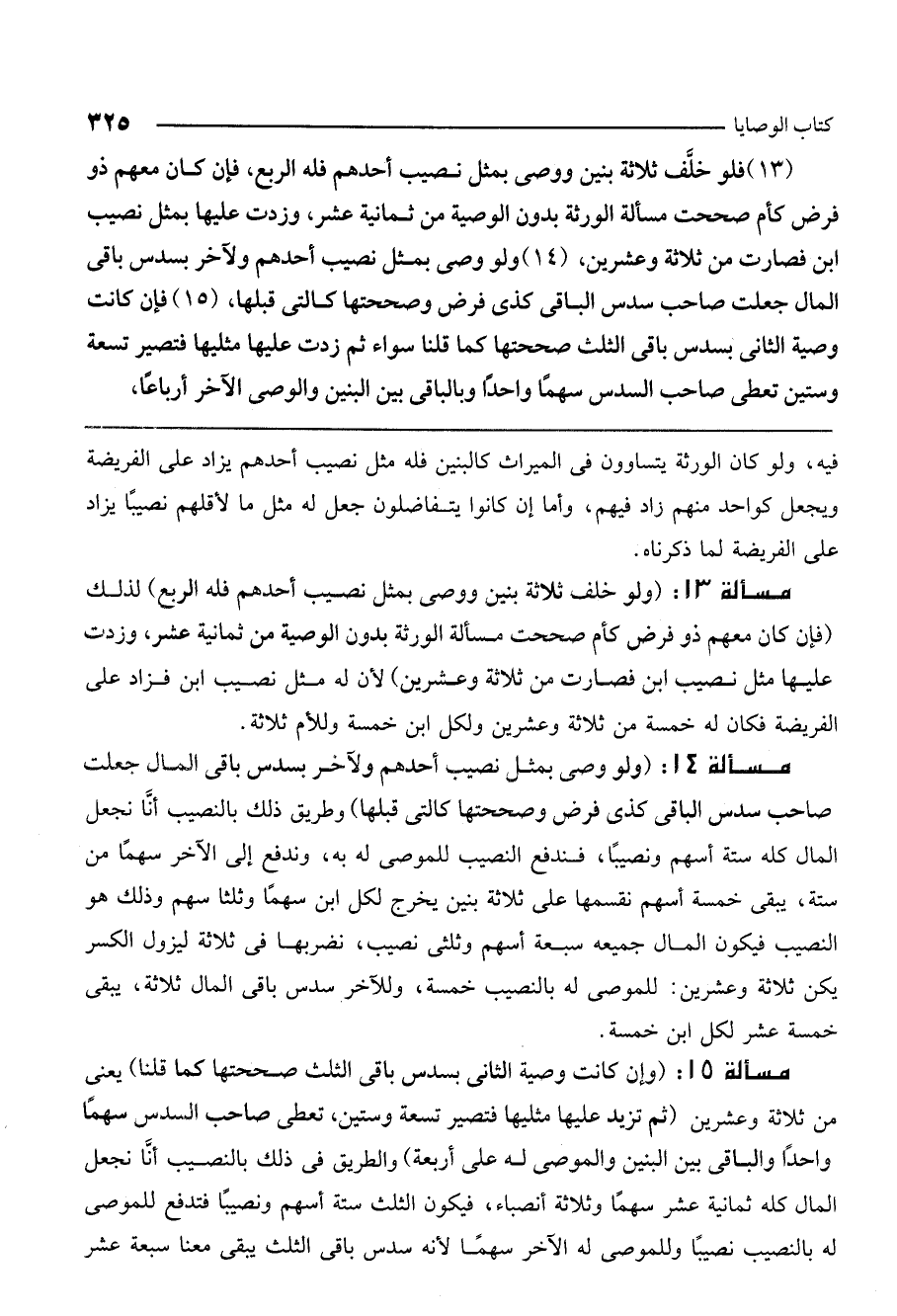 مسألة 14: (ولو وصى بمثل نصيب أحدهم ولآخر بسدس باقي المال جعلت صاحب سدس الباقي كذي فرض وصححتها كالتي قبلها) وطريق ذلك بالنصيب أنا نجعل المال كله ستة أسهم ونصيبًا، فندفع النصيب للموصى له به، وندفع إلى الآخر سهمًا من ستة، يبقى خمسة أسهم نقسمها على ثلاثة بنين، يخرج لكل ابن سهم وثلثا سهم وذلك هو النصيب، فيكون المال جميعه سبعة أسهم وثلثي نصيب، نضربها في ثلاثة ليزول الكسر فيكون ثلاثة وعشرين: للموصى له بالنصيب خمسة، وللآخر سدس باقي المال ثلاثة، يبقى خمسة عشر لكل ابن خمسة.