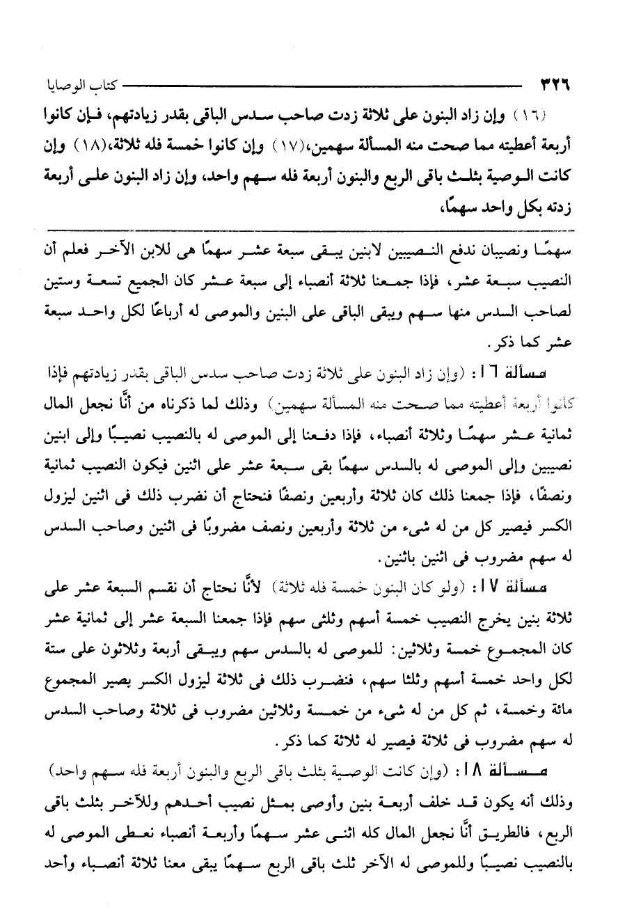 مسألة 16: (وإن زاد البنون على ثلاثة زدت صاحب سدس الباقي بقدر زيادتهم فإذا كانوا أربعة أعطيته مما صحت منه المسألة سهمين) وذلك لما ذكرناه من أنَّا نجعل المال ثمانية عشر سهمًا وثلاثة أنصباء، فإذا دفعنا إلى الموصى له بالنصيب نصيبًا وإلى ابنين نصيبين وإلى الموصى له بالسدس سهمًا بقي سبعة عشر على اثنين فيكون النصيب ثمانية ونصفًا، فإذا جمعنا ذلك كان ثلاثة وأربعين ونصفًا فنحتاج أن نضرب ذلك في اثنين ليزول الكسر، فيصير كل من له شيء من ثلاثة وأربعين ونصف مضروبًا في اثنين وصاحب السدس له سهم مضروب في اثنين باثنين.