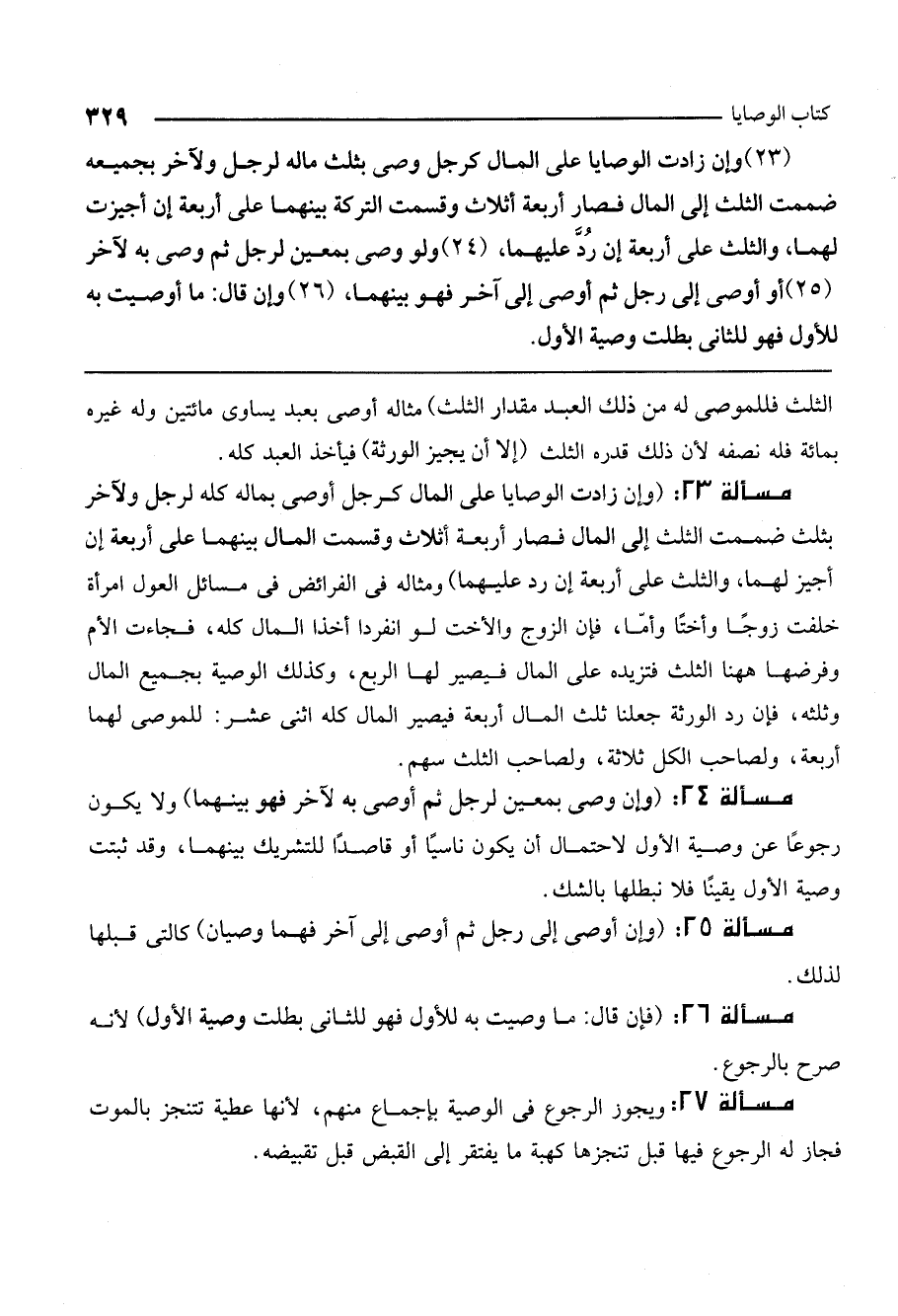 مسألة 23: (وإن زادت الوصايا على المال كرجل أوصى بماله كله لرجل ولآخر بثلث ضممت الثلث إلى المال فصار أربعة أثلاث وقسمت المال بينهما على أربعة إن أجيز لهما، والثلث على أربعة إن رد عليهما) ومثاله في الفرائض في مسائل العول امرأة خلفت زوجًا وأختًا وأمًا، فإن الزوج والأخت لو انفردا أخذا المال كله، فجاءت الأم وفرضها هاهنا الثلث فتزيده على المال فيصير لها الربع، وكذلك الوصية بجميع المال وثلثه، فإن رد الورثة جعلنا ثلث المال أربعة فيصير المال كله اثني عشر: للموصى لهما أربعة، ولصاحب الكل ثلاثة، ولصاحب الثلث سهم.