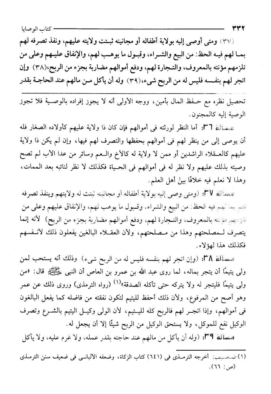 مسألة 38: (إن اتجر لهم بنفسه فليس له من الربح شيء) وذلك أنه يستحب لمن ولي يتيمًا أن يتجر بماله، لما روى عبد الله بن عمرو بن العاص أن النبي - صَلَّى اللَّهُ عَلَيْهِ وَسَلَّمَ - قال: «من ولي يتيمًا فليتجر له ولا يتركه حتى تأكله الصدقة» (رواه الترمذي) ، وروي ذلك عن عمر وهو أصح من المرفوع، ولأن ذلك أحفظ لليتيم لتكون نفقته من فاضله كما يفعل البالغون في أموالهم. وإذا اتجر لهم فالربح كله لليتيم، لأن الولي وكيل اليتيم بالشرع وتصرف الوكيل نفع للموكل، ولا يستحق الوكيل من الربح شيئًا إلا أن يجعل له.