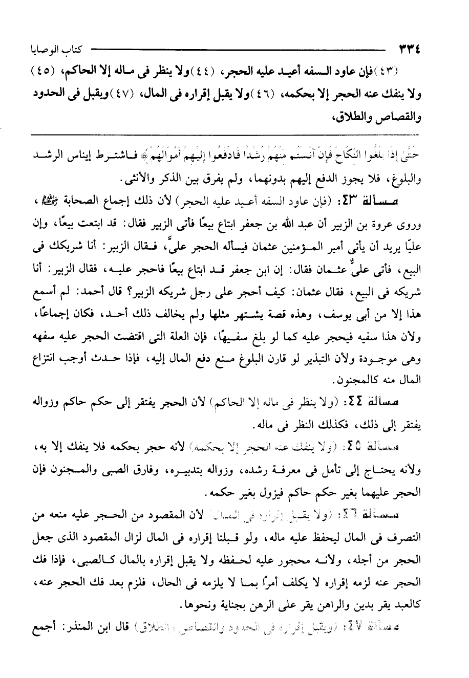 مسألة 43: (فإن عاود السفه أعيد عليه الحجر) لأن ذلك إجماع الصحابة - رَضِيَ اللَّهُ عَنْهُمْ -، وروى عروة بن الزبير أن عبد الله بن جعفر ابتاع بيعًا فأتى الزبير فقال: قد ابتعت بيعًا، وإن عليًا يريد أن يأتي أمير المؤمنين عثمان فيسأله الحجر علي. فقال الزبير: أنا شريكك في البيع. فأتى عليّ عثمان فقال: إن ابن جعفر قد ابتاع بيعًا فاحجر عليه، فقال الزبير: أنا شريكه في البيع، فقال عثمان: كيف أحجر على رجل شريكه الزبير؟ قال أحمد: لم أسمع هذا إلا من أبي يوسف. وهذه قصة يشتهر مثلها ولم يخالف ذلك أحد، فكان إجماعًا. ولأن هذا سفيه فيحجر عليه كما لو بلغ سفيهًا، فإن العلة التي اقتضت الحجر عليه سفهه وهي موجودة، ولأن التبذير لو قارن البلوغ منع دفع المال إليه، فإذا حدث أوجب انتزاع المال منه كالمجنون.