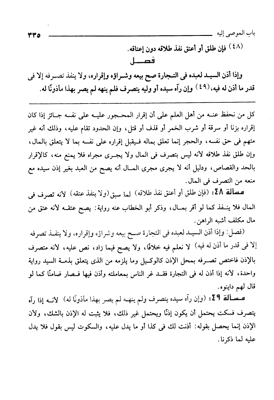 مسألة 49: (وإن رآه سيده يتصرف ولم ينهه لم يصر بهذا مأذونًا له) لأنه إذا رآه يتصرف فسكت يحتمل أن يكون إذنًا ويحتمل غير ذلك، فلا يثبت له الإذن بالشك، ولأن الإذن إنما يحصل بقوله: أذنت لك في كذا أو ما يدل عليه، والسكوت ليس بقول فلا يدل عليه لما ذكرنا.