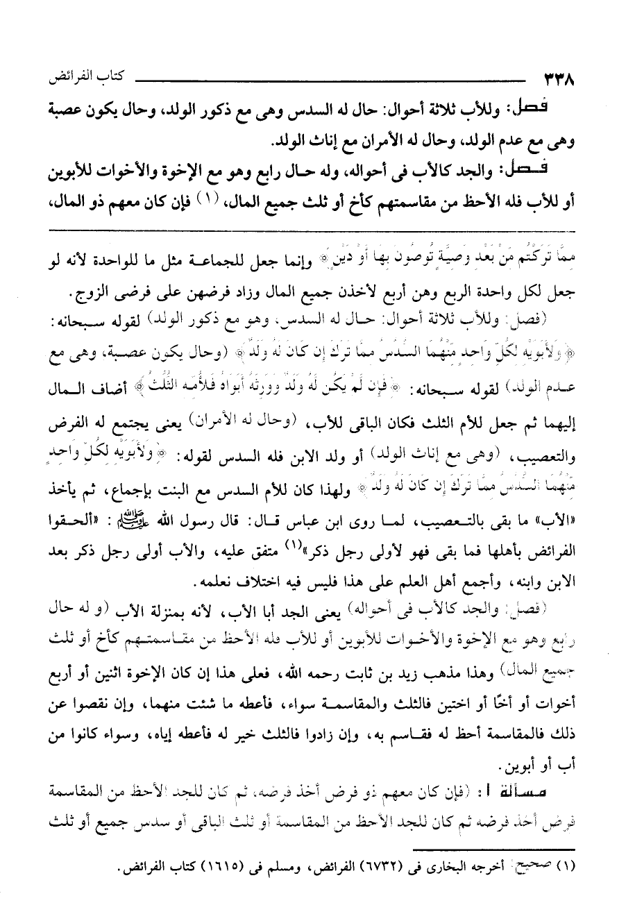 فصل: (وللأب ثلاثة أحوال: حال له السدس، وهو مع ذكور الولد) لقوله سبحانه: {وَلأَبَوَيْهِ لِكُلِّ وَاحِدٍ مِنْهُمَا السُّدُسُ مِمَّا تَرَكَ إِنْ كَانَ لَهُ وَلَدٌ} [النساء: 11] (وحال يكون عصبة، وهي مع عدم الولد) لقوله سبحانه: {فَإِنْ لَمْ يَكُنْ لَهُ وَلَدٌ وَوَرِثَهُ أَبَوَاهُ فَلأُمِّهِ الثُّلُثُ} [النساء: 11] أضاف المال إليهما ثم جعل للأم الثلث فكان الباقي للأب. (وحال له الأمران) يعني يجتمع له الفرض والتعصيب، (وهي مع إناث الولد) أو ولد الابن فله السدس لقوله: {وَلأَبَوَيْهِ لِكُلِّ وَاحِدٍ مِنْهُمَا السُّدُسُ مِمَّا تَرَكَ إِنْ كَانَ لَهُ وَلَدٌ} [النساء: 11] ولهذا كان للأم السدس مع البنت بإجماع، ثم يأخذ "الأب" ما بقي بالتعصيب، لما روى ابن عباس قال: قال رسول الله - صَلَّى اللَّهُ عَلَيْهِ وَسَلَّمَ -: «ألحقوا الفرائض بأهلها فما بقي فهو لأولى رجل ذكر» متفق عليه، والأب أولى رجل ذكر بعد الابن وابنه، وأجمع أهل العلم على هذا فليس فيه اختلاف نعلمه.
