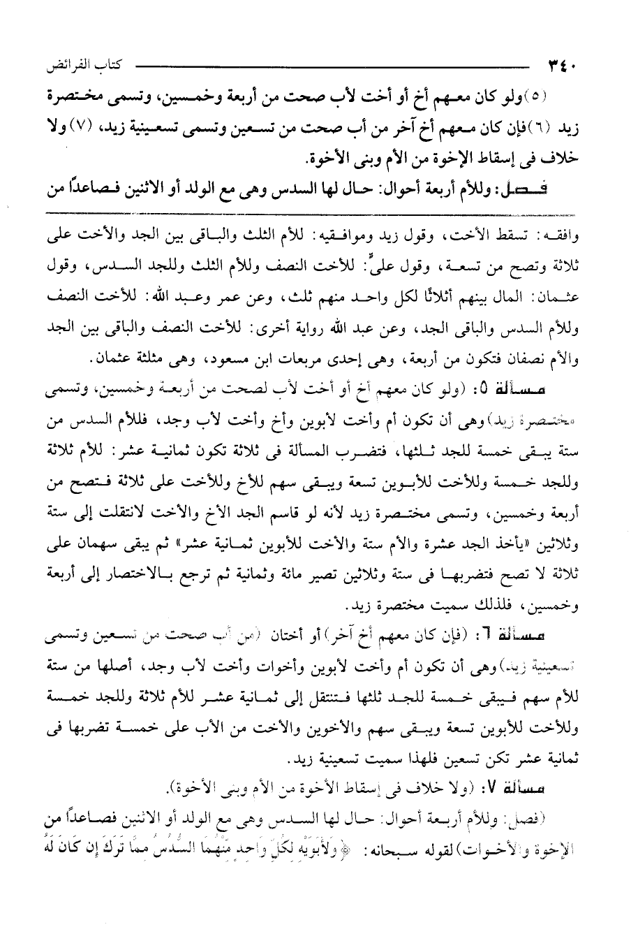 مسألة 5: (ولو كان معهم أخ أو أخت لأب لصحت من أربعة وخمسين، وتسمى مختصرة زيد) وهي أن تكون أم وأخت لأبوين وأخ وأخت لأب وجد، فللأم السدس من ستة، يبقى خمسة للجد ثلثها، فتضرب المسألة في ثلاثة تكون ثمانية عشر: للأم ثلاثة وللجد خمسة وللأخت للأبوين تسعة ويبقى سهم للأخ وللأخت على ثلاثة فتصح من أربعة وخمسين، وتسمى مختصرة زيد لأنه لو قاسم الجد الأخ والأخت لانتقلت إلى ستة وثلاثين "يأخذ الجد عشرة والأم ستة والأخت للأبوين ثمانية عشر" ثم يبقى سهمان على ثلاثة لا تصح فتضربها في ستة وثلاثين تصير مائة وثمانية ثم ترجع بالاختصار إلى أربعة وخمسين، فلذلك سميت مختصرة زيد.