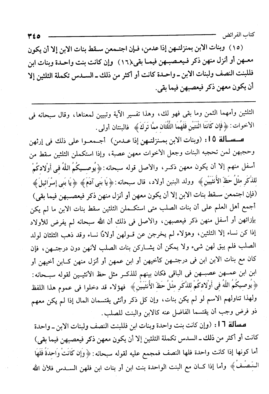 مسألة 15: (وبنات الابن بمنزلتهن إذا عدمن) أجمعوا على ذلك في إرثهن وحجبهن لمن تحجبه البنات وجعل الأخوات معهن عصبة، وإذا استكملن الثلثين سقط من أسفل منهن إلا أن يكون معهن ذكر، والأصل قوله سبحانه: {يُوصِيكُمُ اللَّهُ فِي أَوْلادِكُمْ لِلذَّكَرِ مِثْلُ حَظِّ الأُنْثَيَيْنِ} [النساء: 11] وولد البنين أولاد، قال سبحانه: {يَا بَنِي آدَمَ - يَا بَنِي إِسْرَائِيلَ} [البقرة: 26 - 40] . (فإن اجتمعن سقط بنات الابن إلا أن يكون معهن أو أنزل منهن ذكر فيعصبهن فيما بقي) أجمع أهل العلم على أن بنات الصلب متى استكملن الثلثين سقط بنات الابن ما لم يكن بإزائهن أو أسفل منهن ذكر فيعصبهن، والأصل في ذلك أن الله سبحانه لم يفرض للأولاد إذا كن نساء إلا الثلثين، وهؤلاء لم يخرجن عن كونهن أولادًا نساء، وقد ذهب الثلثان لولد الصلب فلم يبق لهن شيء، ولا يمكن أن يشاركن بنات الصلب لأنهن دون درجتهن. فإن كان مع بنات الابن ابن في درجتهن كأخيهن أو ابن عمهن أو أنزل منهن كابن أخيهن أو ابن ابن عمهن عصبهن في الباقي فكان بينهم للذكر مثل حظ الأنثيين لقوله سبحانه: {يُوصِيكُمُ اللَّهُ فِي أَوْلادِكُمْ لِلذَّكَرِ مِثْلُ حَظِّ الأُنْثَيَيْنِ} [النساء: 11] فهؤلاء قد دخلوا في عموم هذا اللفظ ولهذا تناولهم الاسم لو لم يكن بنات، وإن كل ذكر وأنثى يقتسمان المال إذا لم يكن معهم ذو فرض وجب أن يقتسما الفاضل عنه كالابن والبنت للصلب.