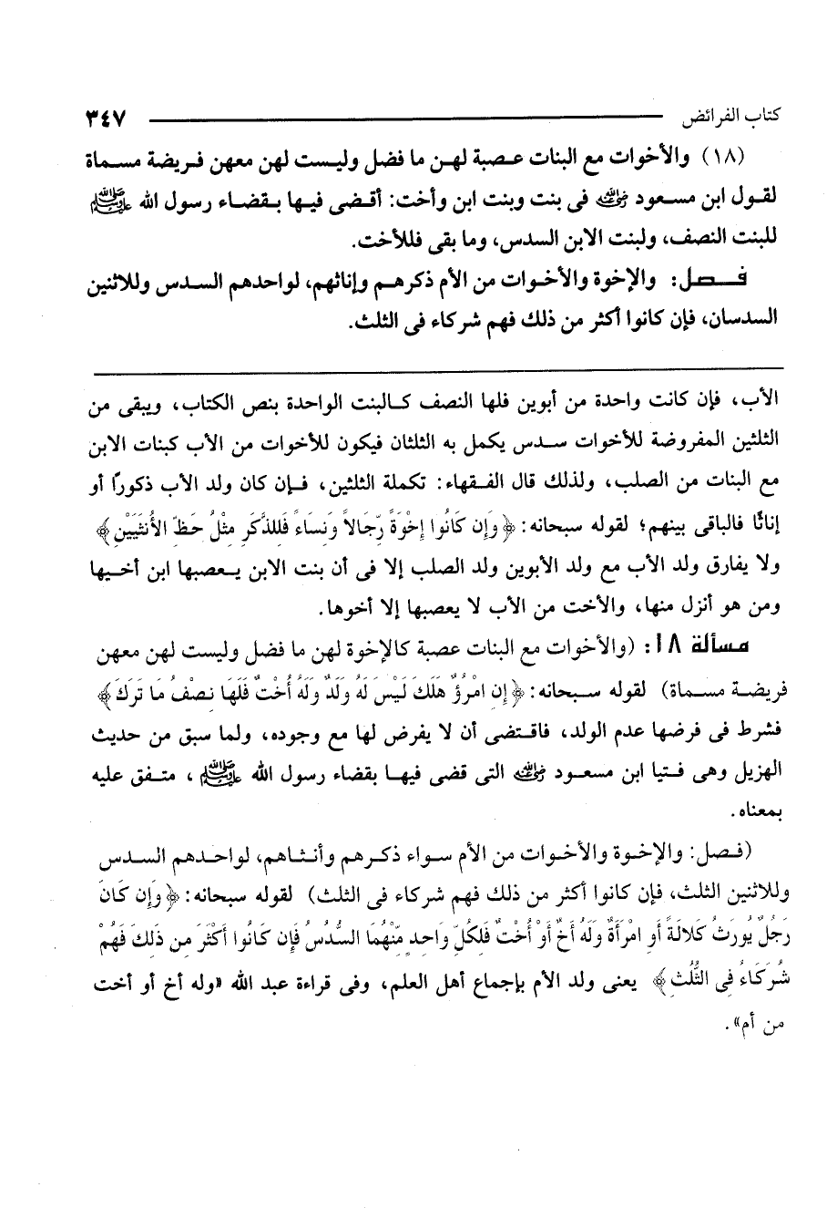 (18) والأخوات مع البنات عصبة لهن ما فضل وليست لهن معهن فريضة مسماة «لقول ابن مسعود - رَضِيَ اللَّهُ عَنْهُ - في بنت وبنت ابن وأخت: أقضي فيها بقضاء رسول الله - صَلَّى اللَّهُ عَلَيْهِ وَسَلَّمَ - للبنت النصف، ولبنت الابن السدس، وما بقي فللأخت»