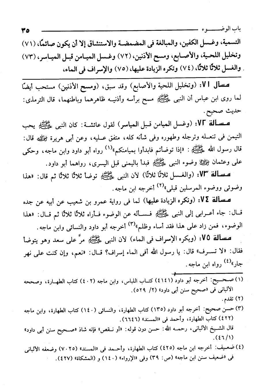 مسألة 74: (وتكره الزيادة عليها) لما في رواية عمرو بن شعيب عن أبيه عن جده قال: «جاء أعرابي إلى النبي - صَلَّى اللَّهُ عَلَيْهِ وَسَلَّمَ - فسأله عن الوضوء فأراه ثلاثاً ثلاثاً ثم قال: "هذا الوضوء، فمن زاد على هذا فقد أساء وظلم» أخرجه أبو داود والنسائي وابن ماجه.
