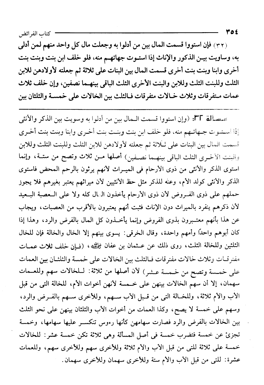 ـــــــــــــــــــــــــــــQمسألة 32: (وإن استووا قسمت المال بين من أدلوا به وسويت بين الذكر والأنثى إذا استوت جهاتهم منه، فلو خلف ابن بنت وبنت بنت أخرى وابنًا وبنت بنت أخرى قسمت المال بين البنات على ثلاثة ثم جعلته لأولادهن للابن الثلث وللبنت الثلث وللابن والبنت الأخرى الثلث الباقي بينهما نصفين) أصلها من ثلاث وتصح من ستة، وإنما استوى الذكر والأنثى من ذوي الأرحام في الميراث لأنهم يرثون بالرحم المحض فاستوى الذكر والأنثى كولد الأم، وعنه للذكر مثل حظ الأنثيين لأن ميراثهم يعتبر بغيرهم فلا يجوز حملهم على ذوي الفروض لأن ذوي الأرحام يأخذون المال كله ولا على العصبة البعيد لأن ذكرهم ينفرد بالميراث دون الإناث، فثبت أنهم يعتبرون بالأقرب من العصبات. ويجاب عن هذا بأنهم معتبرون بذوي الفروض وإنما يأخذون كل المال بالفرض والرد، وهذا إذا كان أبوهم واحدًا وأمهم واحدة. وقال الخرقي: يسوى بينهم إلا الخال والخالة فإن للخال الثلثين وللخالة الثلث، روي ذلك عن عثمان بن عفان - رَضِيَ اللَّهُ عَنْهُ -، (فإن خلف ثلاث عمات مفترقات وثلاث خالات مفترقات فالثلث بين الخالات على خمسة والثلثان بين العمات على خمسة وتصح من خمسة عشر) لأن أصلها من ثلاثة: للخالات سهم وللعمات سهمان، إلا أن سهم الخالات بينهن على خمسة لأنهن أخوات الأم، للخالة التي من قبل الأب والأم ثلاثة، وللخالة التي من قبل الأب سهم، وللأخرى سهم بالفرض والرد. وسهم على خمسة لا يصح، وكذا العمات من أخوات الأب والثلثان بينهن على نحو الثلث بين الخالات بالفرض والرد، فصارت سهامهن كأنها رءوس تنكسر عليها سهامها، وخمسة تجزئ عن خمسة فتضرب خمسة في أصل المسألة وهي ثلاثة تكن خمسة عشر: للخالات خمسة على ثلاثة: للتي من قبل الأب والأم ثلاثة وللأخرى سهم وللأخرى سهم. وللعمات عشرة: للتي من قبل الأب والأم ستة وللأخرى سهمان وللأخرى سهمان.
