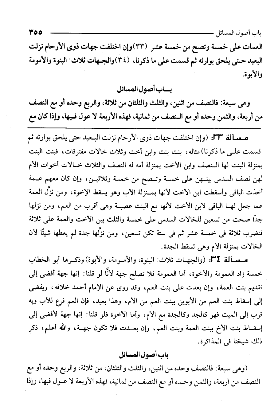 ـــــــــــــــــــــــــــــQمسألة 33: (وإن اختلفت جهات ذوي الأرحام نزلت البعيد حتى يلحق بوارثه ثم قسمت على ما ذكرنا) مثاله: بنت بنت وابن أخت وثلاث خالات مفترقات، فبنت البنت بمنزلة البنت لها النصف وابن الأخت بمنزلة أمه له النصف، والثلاث خالات أخوات الأم لهن نصف السدس بينهن على خمسة وتصح من خمسة وثلاثين. وإن كان معهم عمة أخذت الباقي وأسقطت ابن الأخت لأنها بمنزلة الأب وهو يسقط الإخوة. ومن نزل العمة عما جعل لها الباقي لابن الأخت لأنها مع البنت عصبة وهي أقرب من العم، ومن نزلها جدًا صحت من تسعين، للخالات السدس على خمسة، والثلث بين الأخت والعمة على ثلاثة، فتضرب ثلاثة في خمسة عشر ثم في ستة تكن تسعين. ومن نزلها جدة لم يعطها شيئًا لأن الخالات بمنزلة الأم وهي تسقط الجدة.