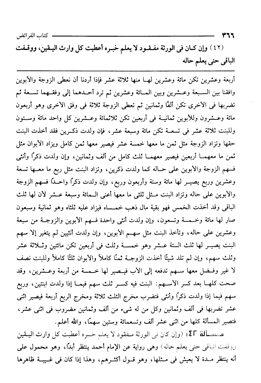 مسألة 42: (وإن كان في الورثة مفقود لا يعلم خبره أعطيت كل وارث اليقين ووقف الباقي حتى يعلم حاله) وهي رواية عن الإمام أحمد ينتظر أبدًا، وهو محمول على أنه ينتظر مدة لا يعيش في مثلها، وهو قول أكثرهم، وهذا إذا كان في غيبة ظاهرها