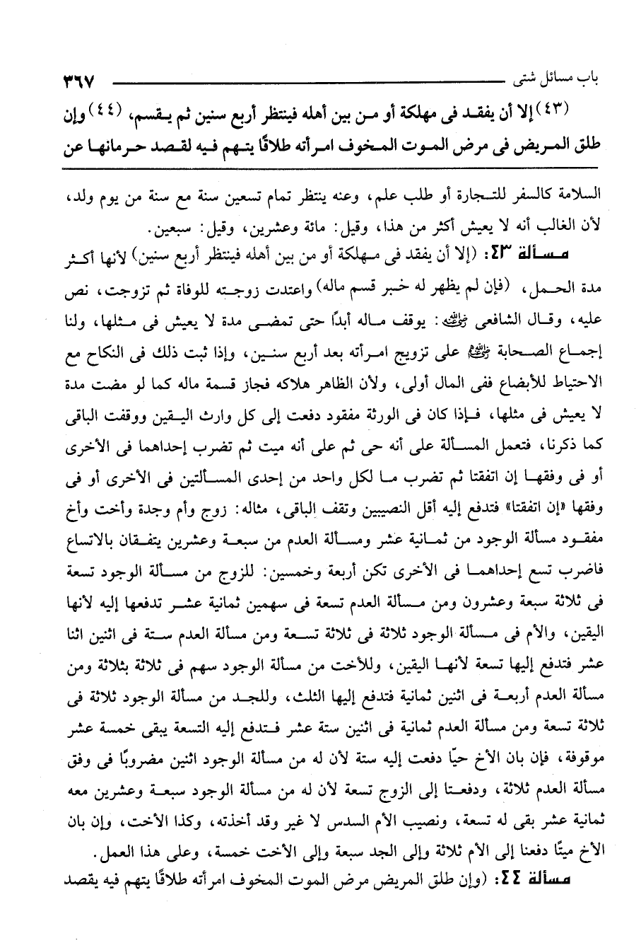 مسألة 43: (إلا أن يفقد في مهلكة أو من بين أهله فينتظر أربع سنين) لأنها أكثر مدة الحمل، (فإن لم يظهر له خبر قسم ماله) واعتدت زوجته للوفاة ثم تزوجت، نص عليه، وقال الشافعي - رَضِيَ اللَّهُ عَنْهُ -: يوقف ماله أبدًا حتى تمضي مدة لا يعيش في مثلها. ولنا إجماع الصحابة - رَضِيَ اللَّهُ عَنْهُمْ - على تزويج امرأته بعد أربع سنين، وإذا ثبت ذلك في النكاح مع الاحتياط للأبضاع ففي المال أولى، ولأن الظاهر هلاكه فجاز قسمة ماله كما لو مضت مدة لا يعيش في مثلها، فإذا كان في الورثة مفقود دفعت إلى كل وارث اليقين ووقفت الباقي كما ذكرنا، فتعمل المسألة على أنه حي ثم على أنه ميت ثم تضرب إحداهما في الأخرى أو في وفقها إن اتفقتا، ثم تضرب ما لكل واحد من إحدى المسألتين في الأخرى أو في وفقها "إن اتفقتا" فتدفع إليه أقل النصيبين وتقف الباقي. مثاله: زوج وأم وجدة وأخت وأخ مفقود، مسألة الوجود من ثمانية عشر، ومسألة العدم من سبعة وعشرين يتفقان بالاتساع فاضرب تسع إحداهما في الأخرى تكن أربعة وخمسين: للزوج من مسألة الوجود تسعة في ثلاثة سبعة وعشرون، ومن مسألة العدم تسعة في سهمين ثمانية عشر تدفعها إليه لأنها اليقين. وللأم في مسألة الوجود ثلاثة في ثلاثة تسعة ومن مسألة العدم ستة في اثنين اثنا عشر فتدفع إليها تسعة لأنها اليقين. وللأخت من مسألة الوجود سهم في ثلاثة بثلاثة ومن مسألة العدم أربعة في اثنين ثمانية فتدفع إليها الثلث، وللجد من مسألة الوجود ثلاثة في ثلاثة تسعة ومن مسألة العدم ثمانية في اثنين ستة عشر فتدفع إليه التسعة يبقى خمسة عشر موقوفة، فإن بان الأخ حيًا دفعت إليه ستة لأن له من مسألة الوجود اثنين مضروبًا في وفق مسألة العدم ثلاثة، ودفعت إلى الزوج تسعة لأن له من مسألة الوجود سبعة وعشرين، معه ثمانية عشر بقي له تسعة، ونصيب الأم السدس لا غير وقد أخذته، وكذا الأخت. وإن بان الأخ ميتًا دفعنا إلى الأم ثلاثة وإلى الجد سبعة وإلى الأخت خمسة وعلى هذا العمل.