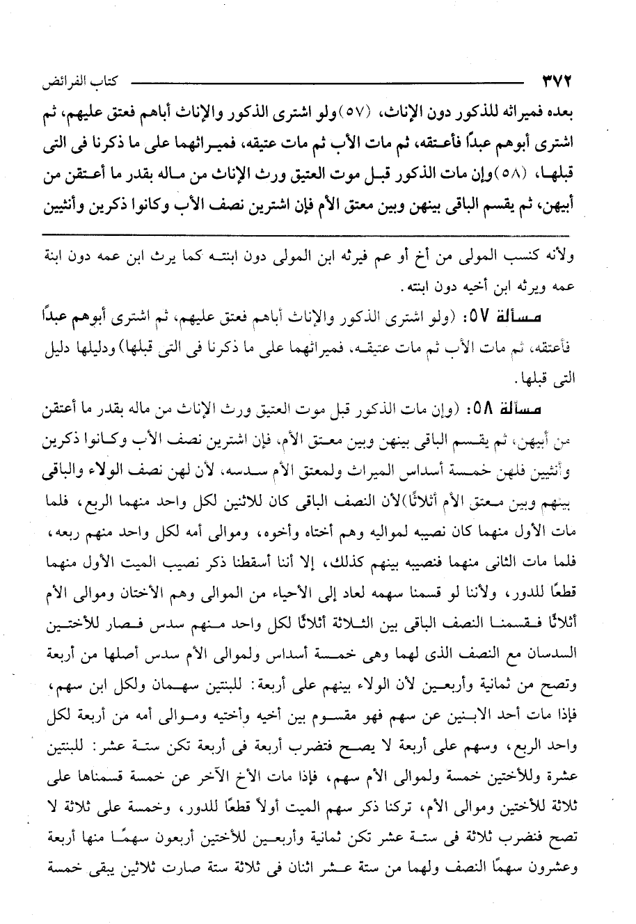 مسألة 58: (وإن مات الذكور قبل موت العتيق ورث الإناث من ماله بقدر ما أعتقن من أبيهن، ثم يقسم الباقي بينهن وبين معتق الأم، فإن اشترين نصف الأب وكانوا ذكرين وأنثيين فلهن خمسة أسداس الميراث ولمعتق الأم سدسه، لأن لهن نصف الولاء والباقي بينهن وبين معتق الأم أثلاثًا) لأن النصف الباقي كان للاثنين لكل واحد منهما الربع، فلما مات الأول منهما كان نصيبه لمواليه وهم أختاه وأخوه، وموالي أمه لكل واحد منهم ربعه، فلما مات الثاني منهما فنصيبه بينهم كذلك، إلا أننا أسقطنا ذكر نصيب الميت الأول منهما قطعًا للدور، ولأننا لو قسمنا سهمه لعاد إلى الأحياء من الموالي وهم الأختان وموالي الأم أثلاثًا فقسمنا النصف الباقي بين الثلاثة أثلاثًا لكل واحد منهم سدس، فصار للأختين السدسان مع النصف الذي لهما وهي خمسة أسداس ولموالي الأم سدس أصلها من أربعة، وتصح من ثمانية وأربعين لأن الولاء بينهم على أربعة: للبنتين سهمان ولكل ابن سهم، فإذا مات أحد الابنين عن سهم فهو مقسوم بين أخيه وأختيه وموالي أمه من أربعة لكل واحد الربع، وسهم على أربعة لا يصح فتضرب أربعة في أربعة تكن ستة عشر: للبنتين عشرة وللأختين خمسة ولموالي الأم سهم، فإذا مات الأخ الآخر عن خمسة قسمناها على ثلاثة للأختين وموالي الأم، تركنا ذكر سهم الميت أولًا قطعًا للدور، وخمسة على ثلاثة لا تصح فنضرب ثلاثة في ستة عشر تكن ثمانية وأربعين، للأختين أربعون سهمًا منها أربعة وعشرون سهمًا النصف، ولهما من ستة عشر اثنان في ثلاثة ستة صارت ثلاثين، يبقى خمسة