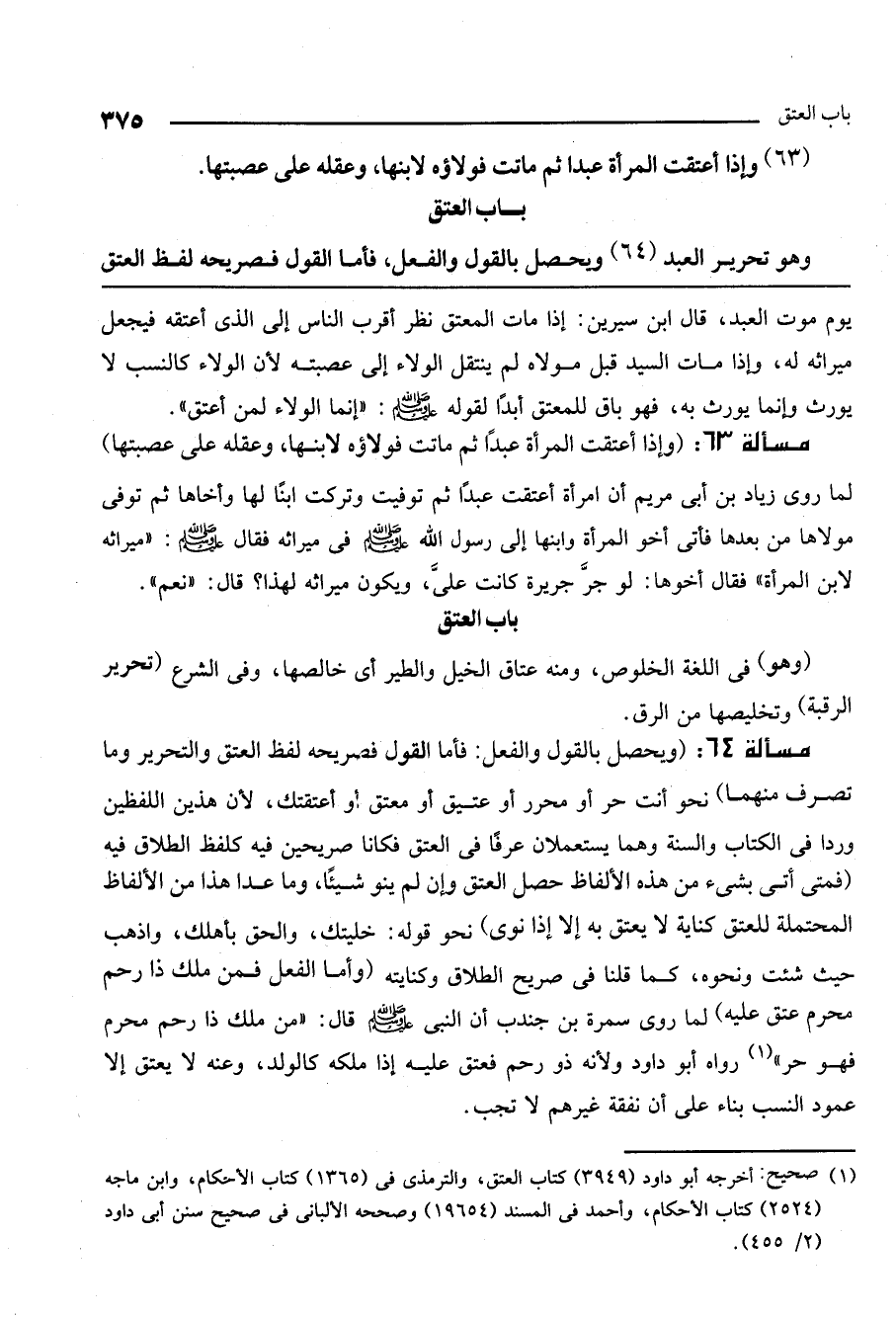 مسألة 63: (وإذا أعتقت المرأة عبدا ثم ماتت فولاؤه لابنها، وعقله على عصبتها) لما «روى زياد بن أبي مريم أن امرأة أعتقت عبدًا ثم توفيت وتركت ابنًا لها وأخاها، ثم توفي مولاها من بعدها فأتى أخو المرأة وابنها إلى رسول الله - صَلَّى اللَّهُ عَلَيْهِ وَسَلَّمَ - في ميراثه فقال - صَلَّى اللَّهُ عَلَيْهِ وَسَلَّمَ -: "ميراثه لابن المرأة" فقال أخوها: لو جر جريرة كانت علي، ويكون ميراثه لهذا؟ قال: "نعم» .