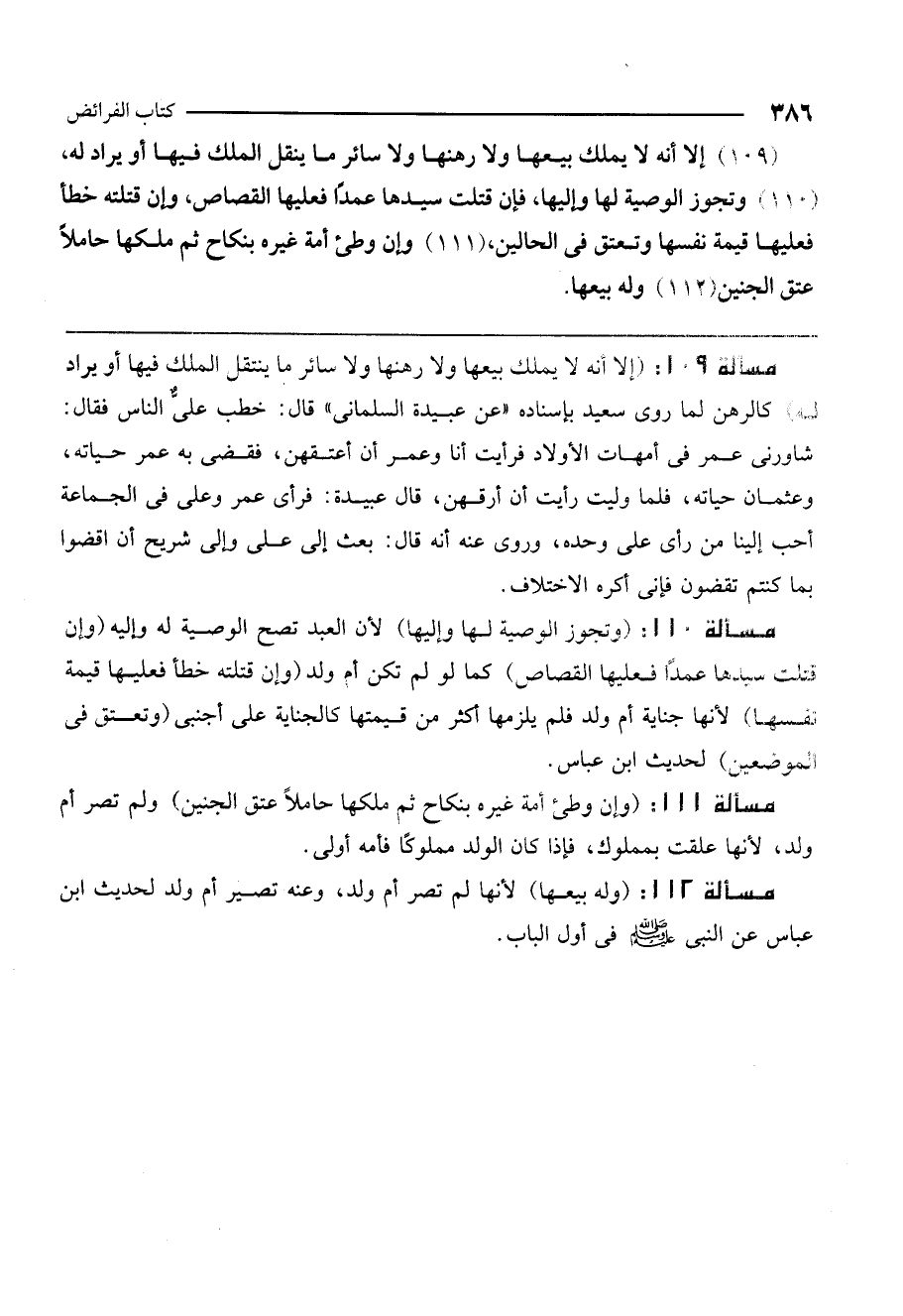 ـــــــــــــــــــــــــــــQمسألة 109: (إلا أنه لا يملك بيعها ولا رهنها ولا سائر ما ينتقل الملك فيها أو يراد له) كالرهن لما روى سعيد بإسناده " عن عبيدة السلماني " قال: خطب عليٌّ الناس فقال: شاورني عمر في أمهات الأولاد فرأيت أنا وعمر أن أعتقهن، فقضى به عمر حياته، وعثمان حياته، فلما وليت رأيت أن أرقهن. قال عبيدة: فرأي عمر وعلي في الجماعة أحب إلينا من رأي علي وحده. وروي عنه أنه قال: بعث إلى علي وإلى شريح أن اقضوا بما كنتم تقضون فإني أكره الاختلاف.