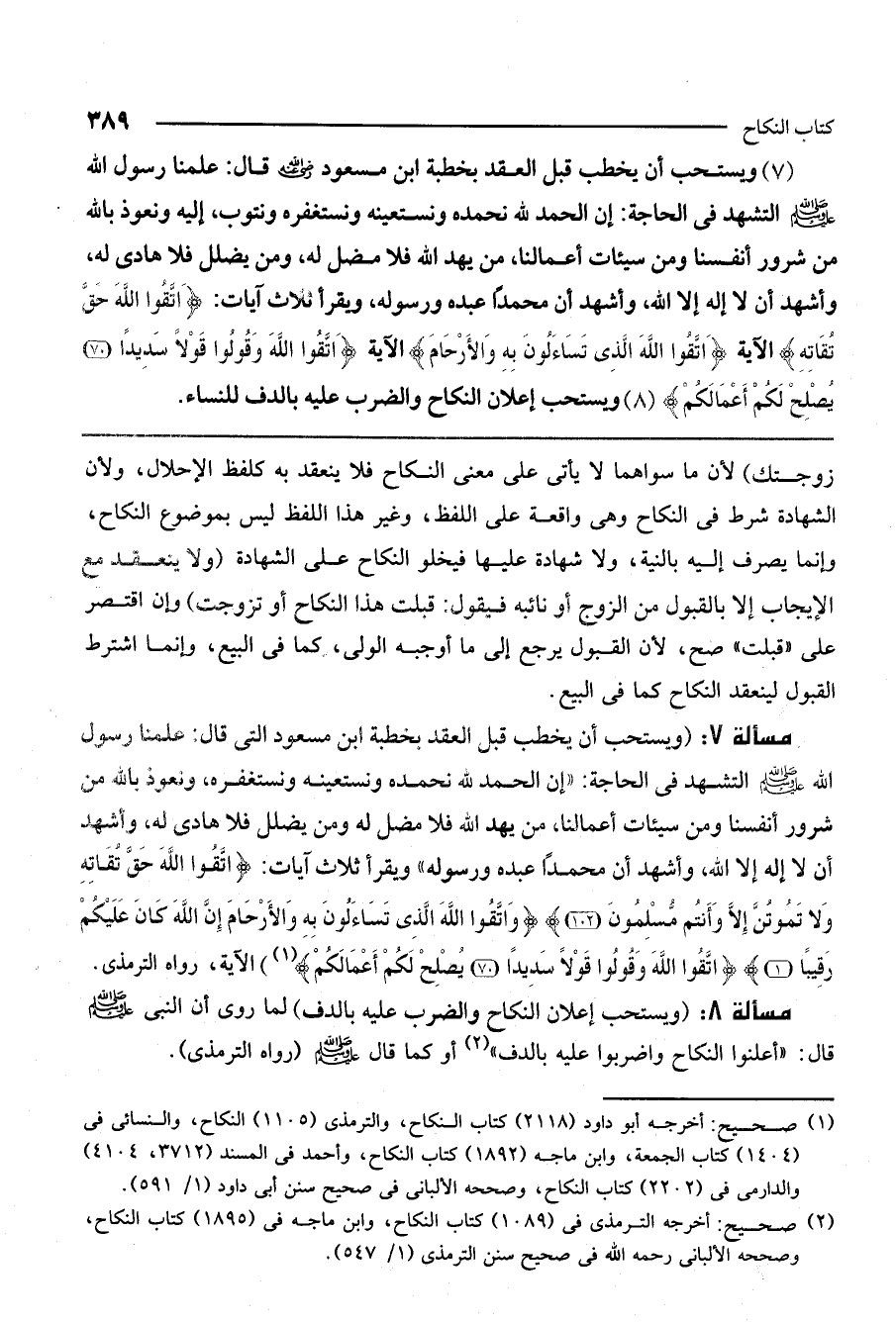 (7) ويستحب أن يخطب قبل العقد بخطبة ابن مسعود - رَضِيَ اللَّهُ عَنْهُ - قال: «علمنا رسول الله - صَلَّى اللَّهُ عَلَيْهِ وَسَلَّمَ - التشهد في الحاجة: إن الحمد لله نحمده ونستعينه ونستغفره ونتوب إليه، ونعوذ بالله من شرور أنفسنا ومن سيئات أعمالنا، من يهد الله فلا مضل له، ومن يضلل فلا هادي له، وأشهد أن لا إله إلا الله، وأشهد أن محمدًا عبده ورسوله، ويقرأ ثلاث آيات: {اتَّقُوا اللَّهَ حَقَّ تُقَاتِهِ} [آل عمران: 102] الآية {وَاتَّقُوا اللَّهَ الَّذِي تَسَاءَلُونَ بِهِ وَالأَرْحَامَ} [النساء: 1] الآية {اتَّقُوا اللَّهَ وَقُولُوا قَوْلا سَدِيدًا} [الأحزاب: 70] {يُصْلِحْ لَكُمْ أَعْمَالَكُمْ} [الأحزاب: 71] »