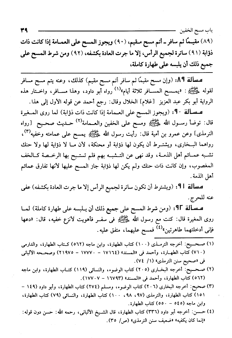 مسألة 90: (ويجوز المسح على العمامة إذا كانت ذات ذؤابة) لما روى المغيرة قال: «توضأ رسول الله - صَلَّى اللَّهُ عَلَيْهِ وَسَلَّمَ - ومسح على الخفين والعمامة» حديث صحيح [رواه الترمذي] وعن عمرو بن أمية قال: «رأيت رسول الله - صَلَّى اللَّهُ عَلَيْهِ وَسَلَّمَ - يمسح على عمامته وخفيه» رواهما البخاري، ويشترط أن يكون لها ذؤابة أو محنكة، لأن ما لا ذؤابة لها ولا حنك تشبه عمائم أهل الذمة، وقد نهي عن التشبه بهم فلم تستبح بها الرخصة كالخف المغصوب، وإن كانت ذات حنك ولم يكن لها ذؤابة جاز المسح عليها لأنها تفارق عمائم أهل الذمة.