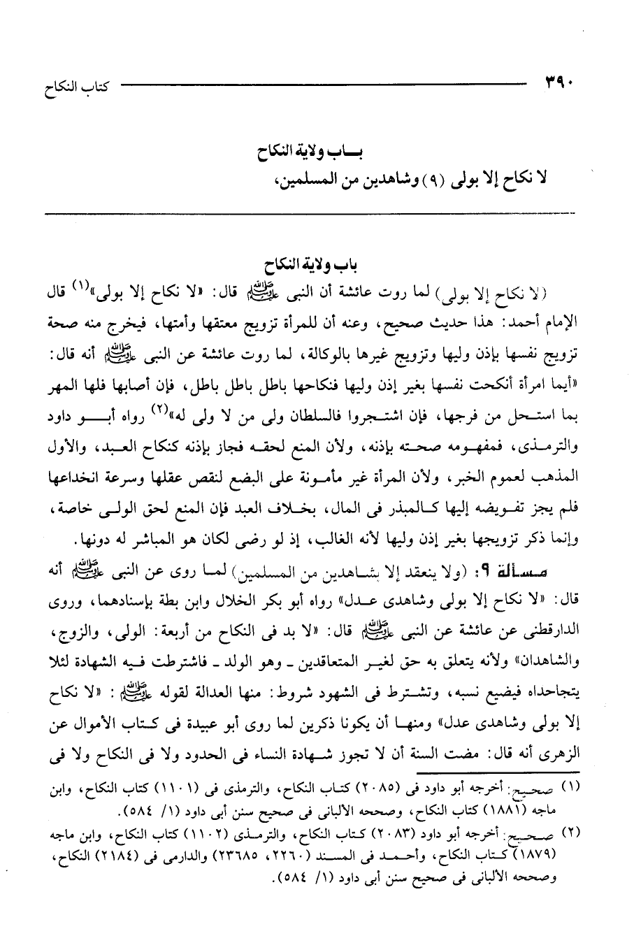 مسألة 9: (ولا ينعقد إلا بشاهدين من المسلمين) لما روي عن النبي - صَلَّى اللَّهُ عَلَيْهِ وَسَلَّمَ - أنه قال: " «لا نكاح إلا بولي وشاهدي عدل» رواه أبو بكر الخلال وابن بطة بإسنادهما. وروى الدارقطني عن عائشة عن النبي - صَلَّى اللَّهُ عَلَيْهِ وَسَلَّمَ - قال: «لا بد في النكاح من أربعة: الولي، والزوج، والشاهدان» " ولأنه يتعلق به حق لغير المتعاقدين - وهو الولد - فاشترطت فيه الشهادة لئلا يتجاحداه فيضيع نسبه. وتشترط في الشهود شروط، منها العدالة لقوله - صَلَّى اللَّهُ عَلَيْهِ وَسَلَّمَ -: «لا نكاح إلا بولي وشاهدي عدل» ، ومنها أن يكونا ذكرين لما روى أبو عبيدة في كتاب الأموال عن الزهري أنه قال: مضت السنة أن لا تجوز شهادة النساء في الحدود ولا في النكاح ولا في