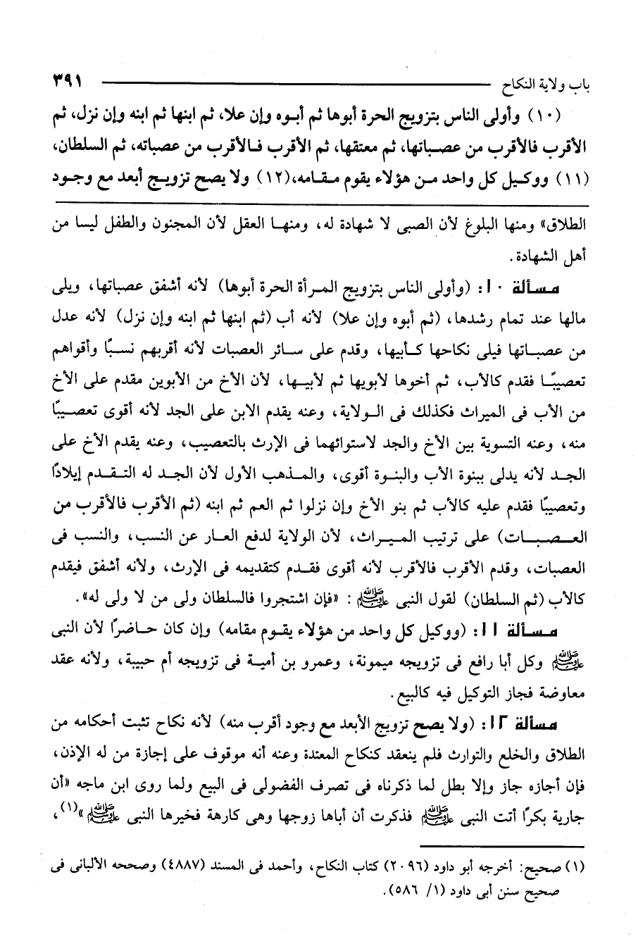 مسألة 10: (وأولى الناس بتزويج المرأة الحرة أبوها) لأنه أشفق عصباتها، ويلي مالها عند تمام رشدها، (ثم أبوه وإن علا) لأنه أب (ثم ابنها ثم ابنه وإن نزل) لأنه عدل من عصباتها فيلي نكاحها كأبيها، وقدم على سائر العصبات لأنه أقربهم نسبًا وأقواهم تعصيبًا فقدم كالأب، ثم أخوها لأبويها ثم لأبيها، لأن الأخ من الأبوين مقدم على الأخ من الأب في الميراث فكذلك في الولاية، وعنه يقدم الابن على الجد لأنه أقوى تعصيبًا منه، وعنه التسوية بين الأخ والجد لاستوائهما في الإرث بالتعصيب، وعنه يقدم الأخ على الجد لأنه يدلي ببنوة الأب والبنوة أقوى، والمذهب الأول لأن الجد له التقدم إيلادًا وتعصيبًا فقدم عليه كالأب ثم بنو الأخ وإن نزلوا ثم العم ثم ابنه (ثم الأقرب فالأقرب من العصبات) على ترتيب الميراث، لأن الولاية لدفع العار عن النسب، والنسب في العصبات، وقدم الأقرب فالأقرب لأنه أقوى فقدم كتقديمه في الإرث، ولأنه أشفق فيقدم كالأب، (ثم السلطان) لقول النبي - صَلَّى اللَّهُ عَلَيْهِ وَسَلَّمَ -: «فإن اشتجروا فالسلطان ولي من لا ولي له» .