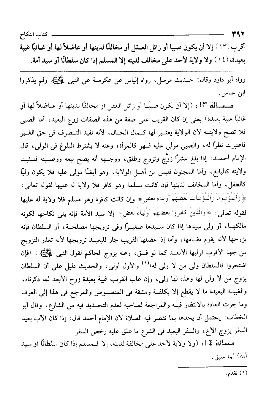 مسألة 13: (إلا أن يكون صبيًا أو زائل العقل أو مخالفًا لدينها أو عاضلًا لها أو غائبًا غيبة بعيدة) يعني إن كان القريب على صفة من هذه الصفات زوج البعيد، أما الصبي فلا تصح ولايته لأن الولاية يعتبر لها كمال الحال، لأنها تفيد التصرف في حق الغير فاعتبرت نظرًا له، والصبي مولى عليه فهو كالمرأة، وعنه لا يشترط البلوغ في الولي، قال الإمام أحمد: إذا بلغ عشرًا زوج وتزوج وطلق، ووجهه أنه يصح بيعه ووصيته فتثبت ولايته كالبالغ، وأما المجنون فليس من أهل الولاية، وهو أيضًا مولى عليه فلا يكون وليًا كالطفل. وأما المخالف لدينها فإن كانت مسلمة وهو كافر فلا ولاية له عليها لِقَوْلِهِ تَعَالَى: {وَالْمُؤْمِنُونَ وَالْمُؤْمِنَاتُ بَعْضُهُمْ أَوْلِيَاءُ بَعْضٍ} [التوبة: 71] وإن كانت كافرة وهو مسلم فلا ولاية له عليها لِقَوْلِهِ تَعَالَى: {وَالَّذِينَ كَفَرُوا بَعْضُهُمْ أَوْلِيَاءُ بَعْضٍ} [الأنفال: 73] إلا سيد الأمة فإنه يلي نكاحها لكونه مالكها، أو ولي سيدها إذا كان سيدها صغيرًا وفي تزويجها مصلحة، أو السلطان فإنه يزوجها لأنه يقوم مقامها. وأما إذا عضلها القريب جاز للبعيد تزويجها لأنه تعذر التزويج من جهة الأقرب فوليها الأبعد كما لو فسق، وعنه يزوج الحاكم لقول النبي - صَلَّى اللَّهُ عَلَيْهِ وَسَلَّمَ -: «فإن اشتجروا فالسلطان ولي من لا ولي له» والأول أولى. والحديث دليل على أن السلطان يزوج من لا ولي لها وهذه لها ولي. وإن غاب القريب غيبة بعيدة زوج الأبعد لما ذكرناه، والغيبة البعيدة ما لا يقطع إلا بكلفة ومشقة في المنصوص، والمرجع في هذا إلى العرف وما جرت العادة بالانتظار فيه والمراجعة لصاحبه لعدم التحديد فيه من الشارع. وقال أبو الخطاب: يحتمل أن يحدها بما تقصر فيه الصلاة لأن الإمام أحمد قال: إذا كان الأب بعيد السفر يزوج الأخ، والسفر البعيد في الشرع ما علق عليه رخص السفر.