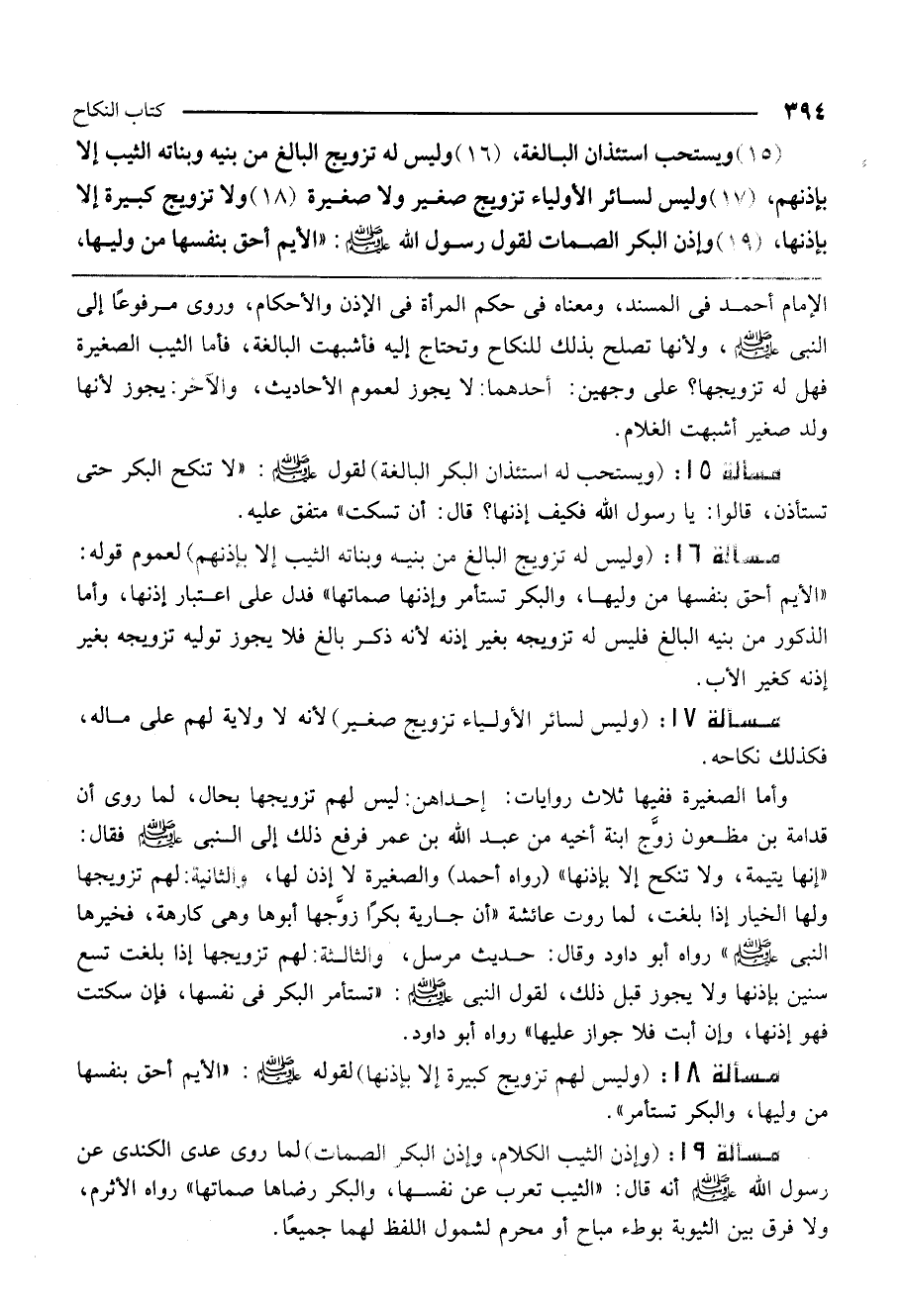 مسألة 18: (وليس لهم تزويج كبيرة إلا بإذنها) لقوله - صَلَّى اللَّهُ عَلَيْهِ وَسَلَّمَ -: «الأيم أحق بنفسها من وليها، والبكر تستأمر» .